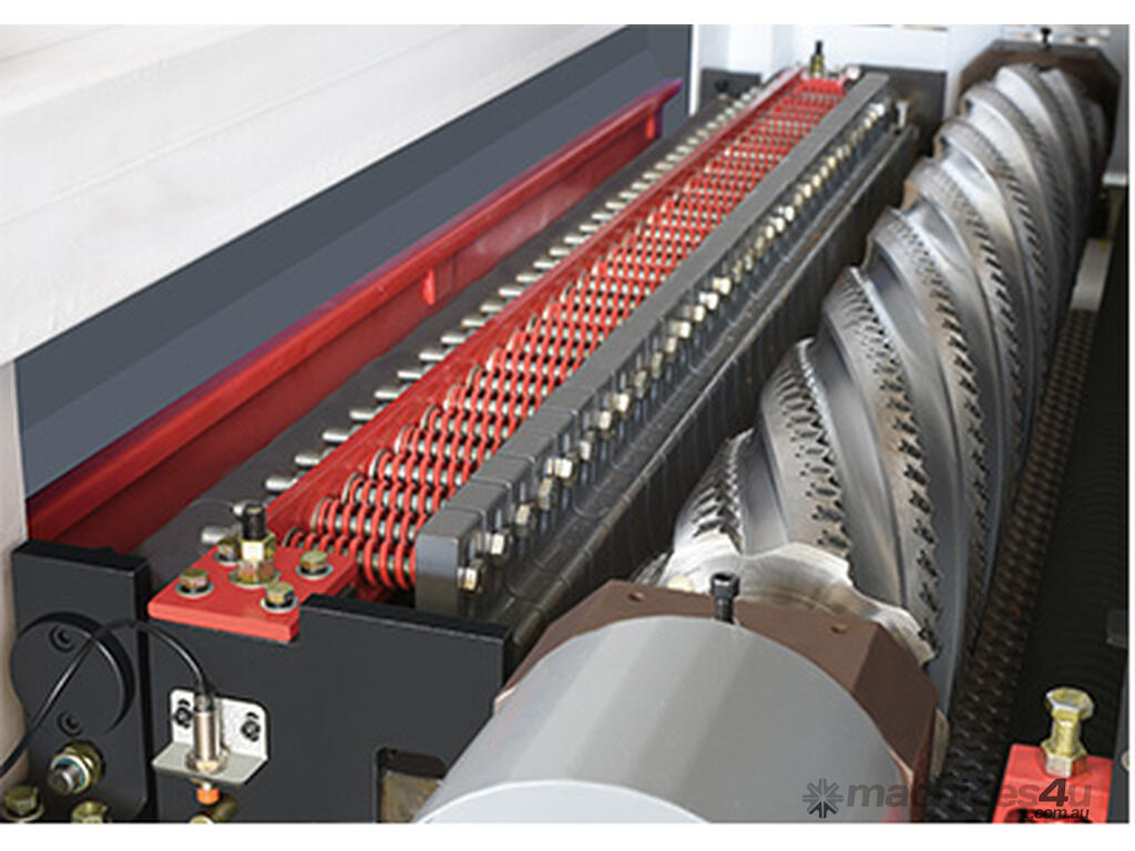 Rise and fall of feed conveyor table with keypad programmable automatic height setting of the feed table using an imported Taiwanese electronic controller and digital readout.