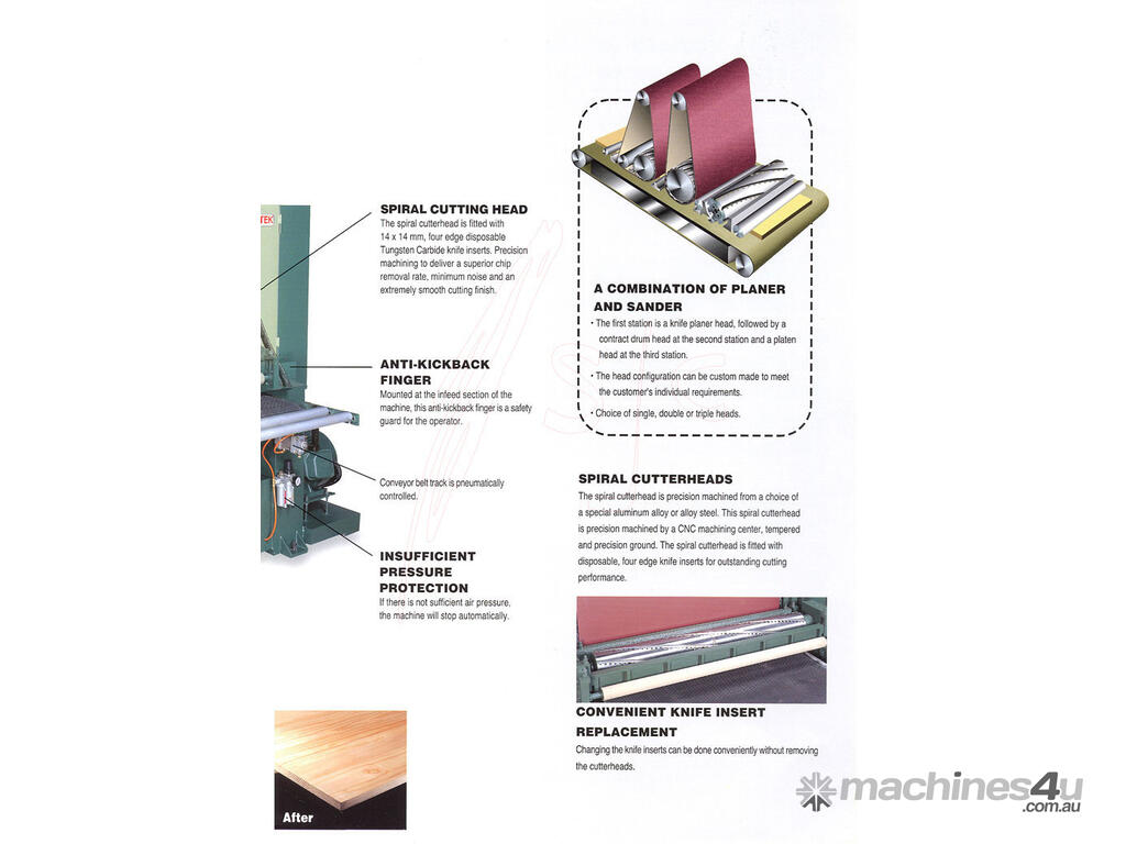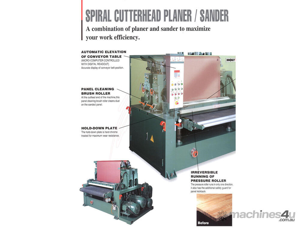 The planer sander is designed with "Spiral Knife " cutterblock on the front group in place of conventional calibration roller for stock removal of up to 2mm.