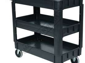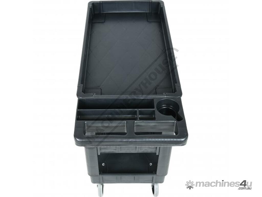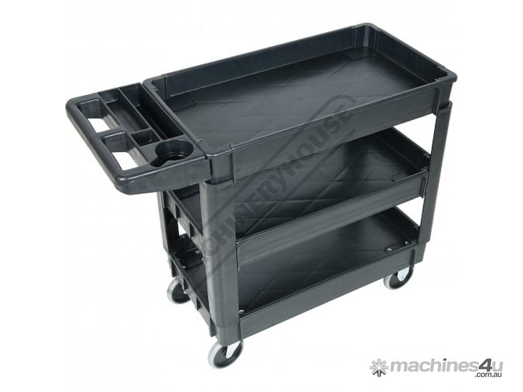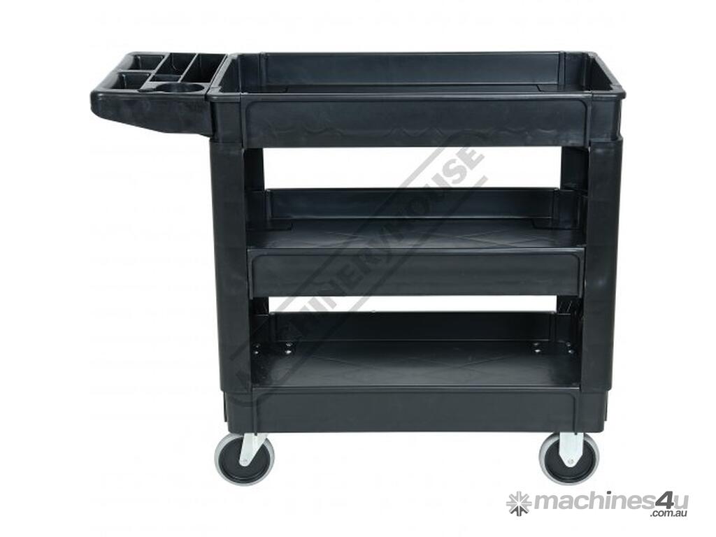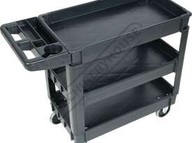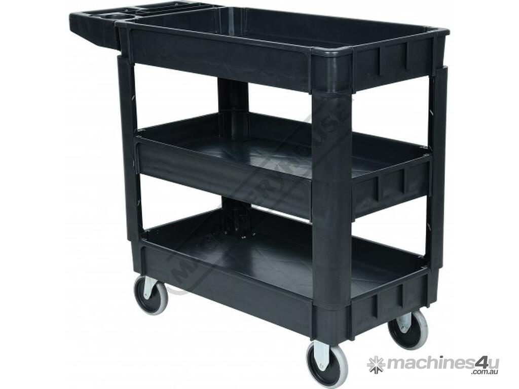 This movable service cart made from heavy duty plastic, 3 huge storage trays, includes an attached handle with spanner/tool holder, 250kg total load rating, ideal for the workshop or garage.