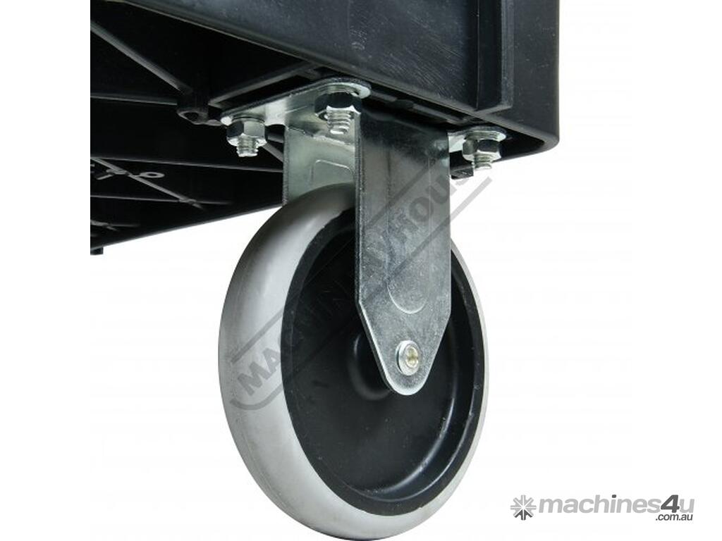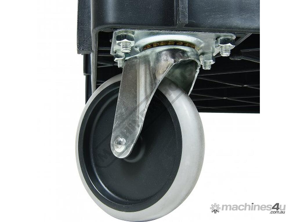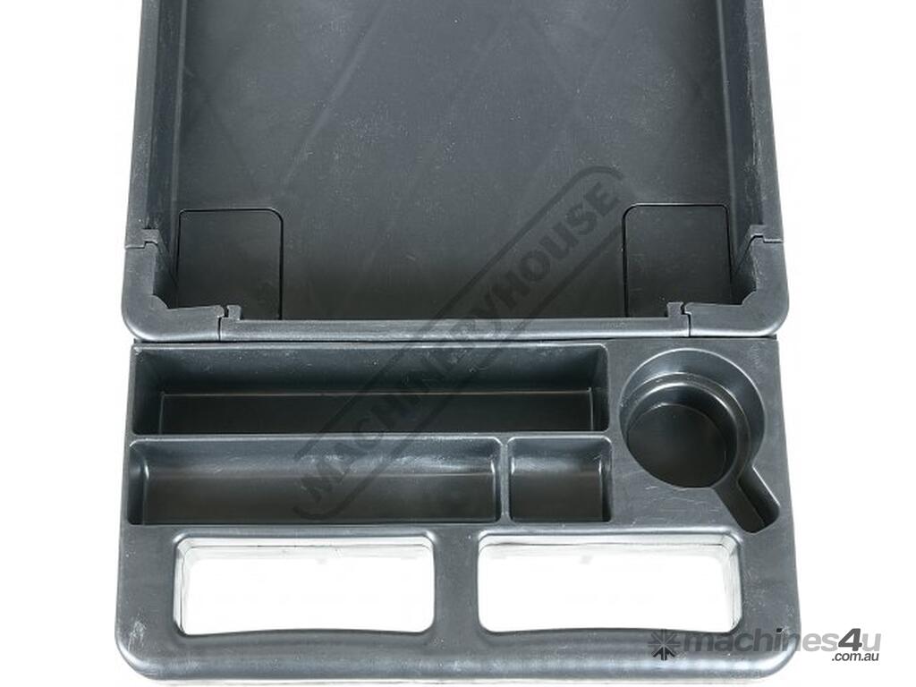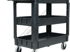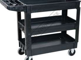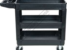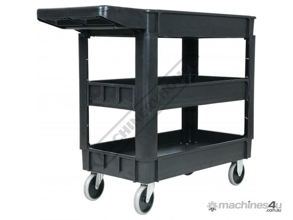 This movable service cart made from heavy duty plastic, 3 huge storage trays, includes an attached handle with spanner/tool holder, 250kg total load rating, ideal for the workshop or garage.