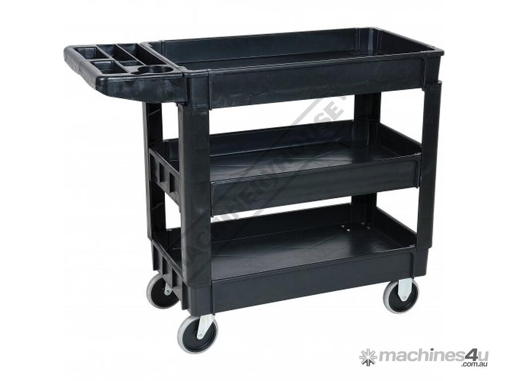 This movable service cart made from heavy duty plastic, 3 huge storage trays, includes an attached handle with spanner/tool holder, 250kg total load rating, ideal for the workshop or garage.