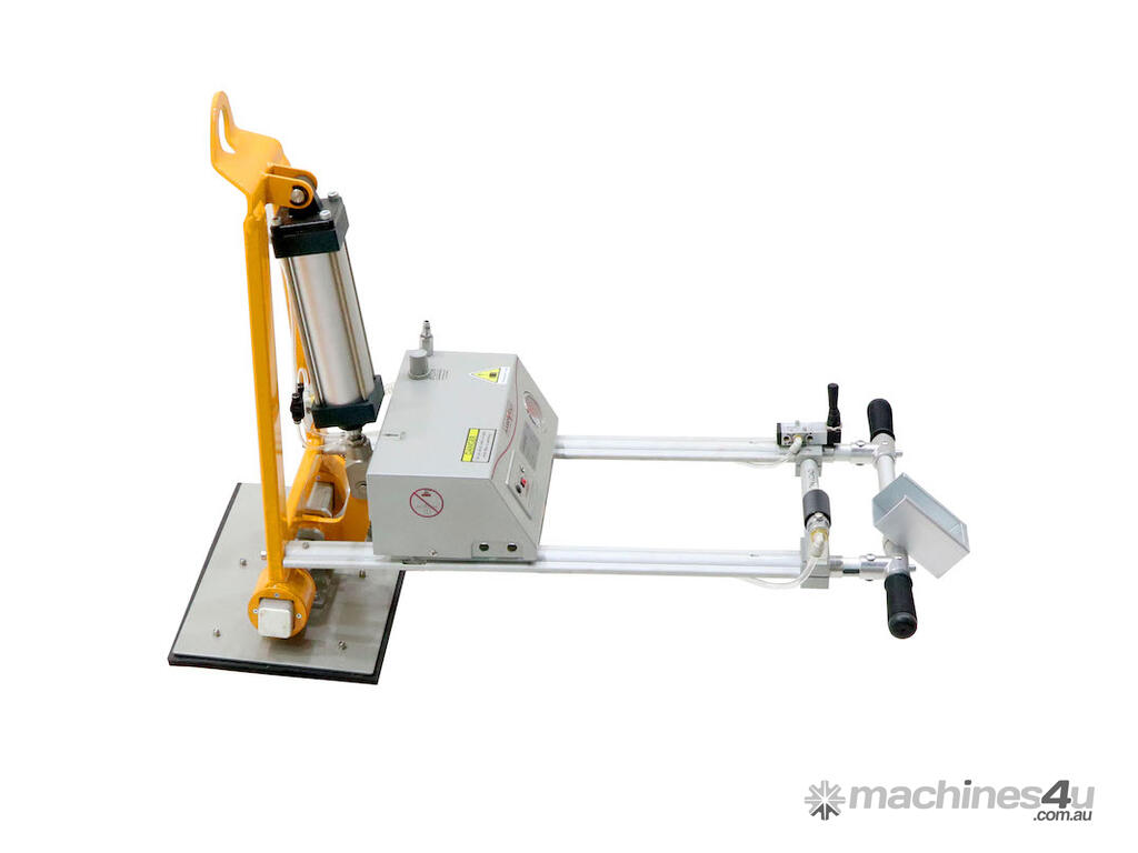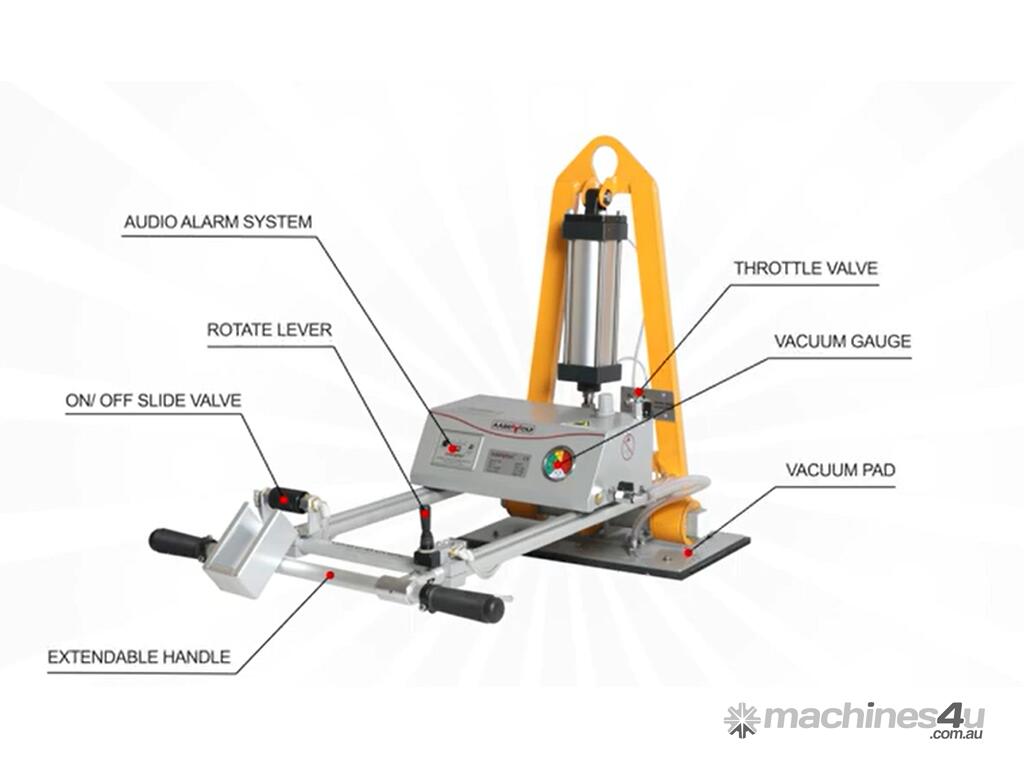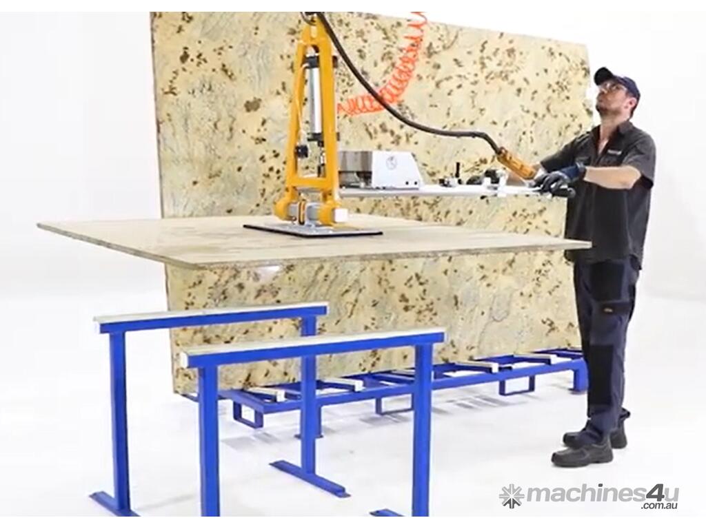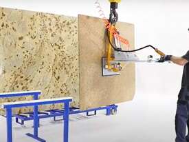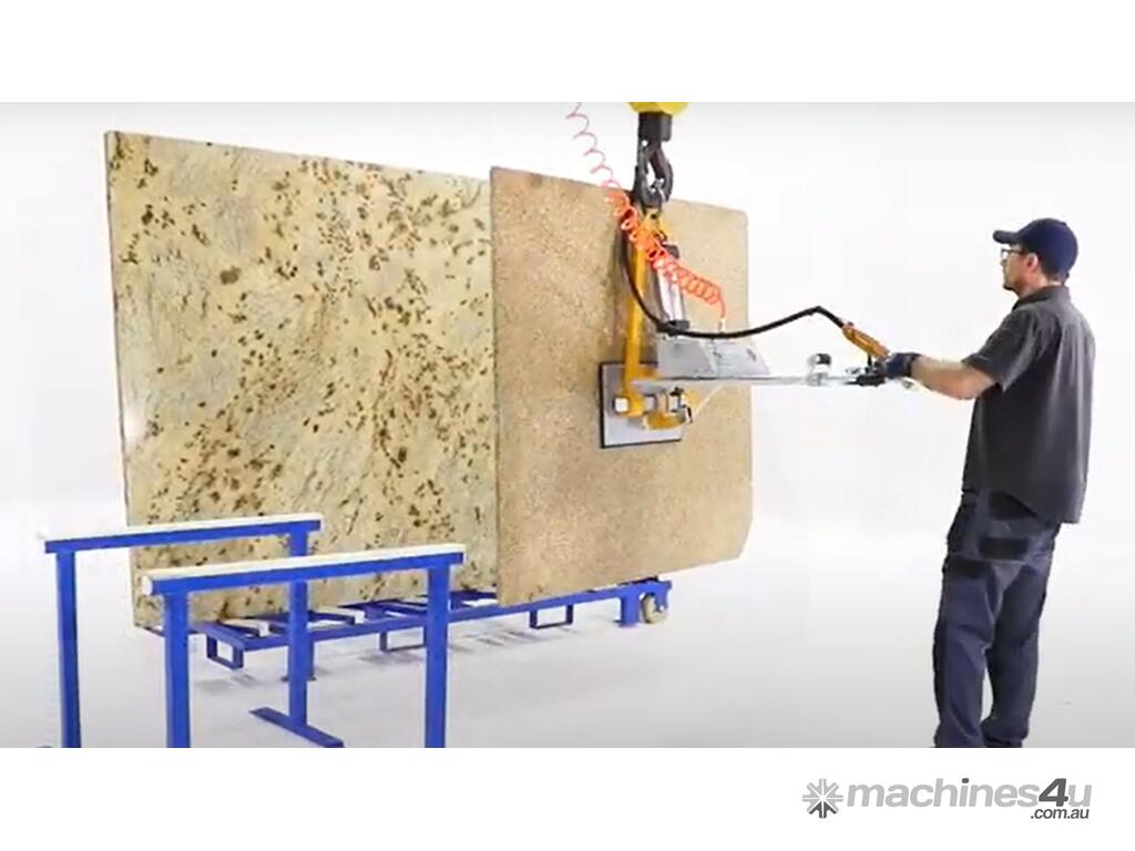 This vacuum lifter is designed to lift smooth or rough marble and granite slabs. Featuring rugged construction with the ability to lift and tilt the stone. Powered by compressed air.