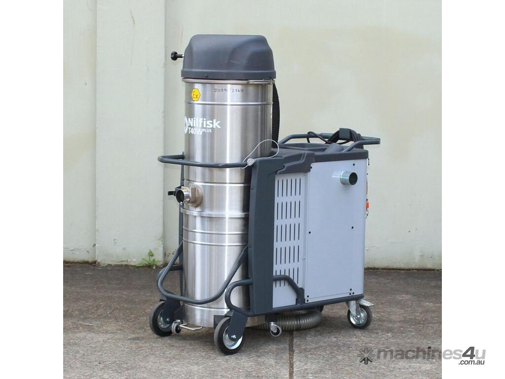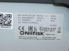 Portable Industrial Vacuum Cleaner,"Nilfisk" model T40WPLUS LZ22, 100 litre capacity, heavy-duty 3 phase 4kW unit with robust construction, built 2019, fitted with L type filtration and ATEX Ex rated design for safe operation in hazardous environments, designed for continuous use in industrial applications, suitable for recovery of dust, solids and liquids, compact mobile design with easy manoeuvrability, 415V three phase power supply