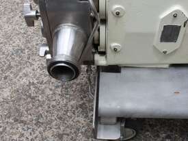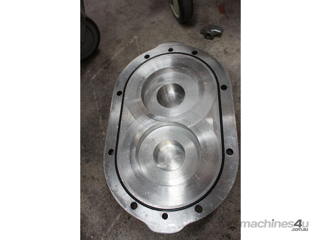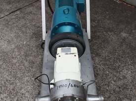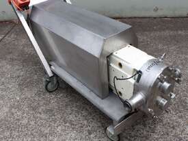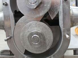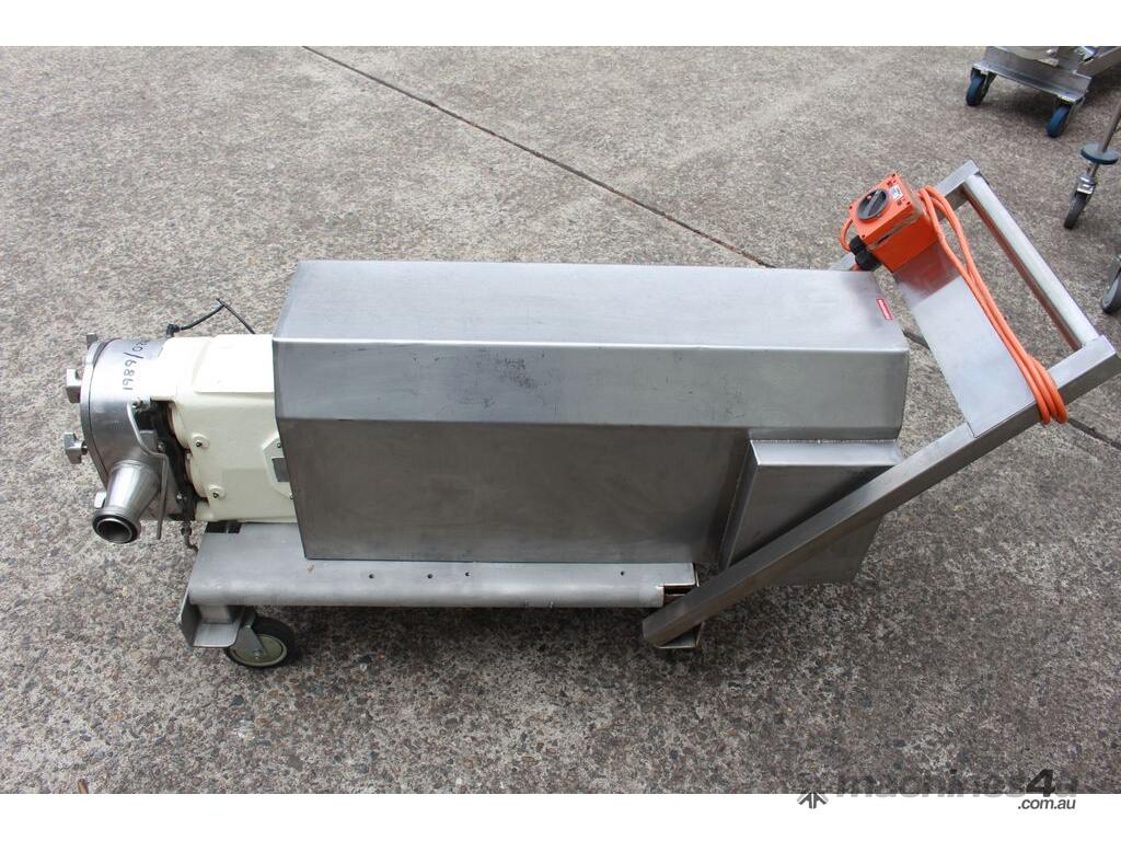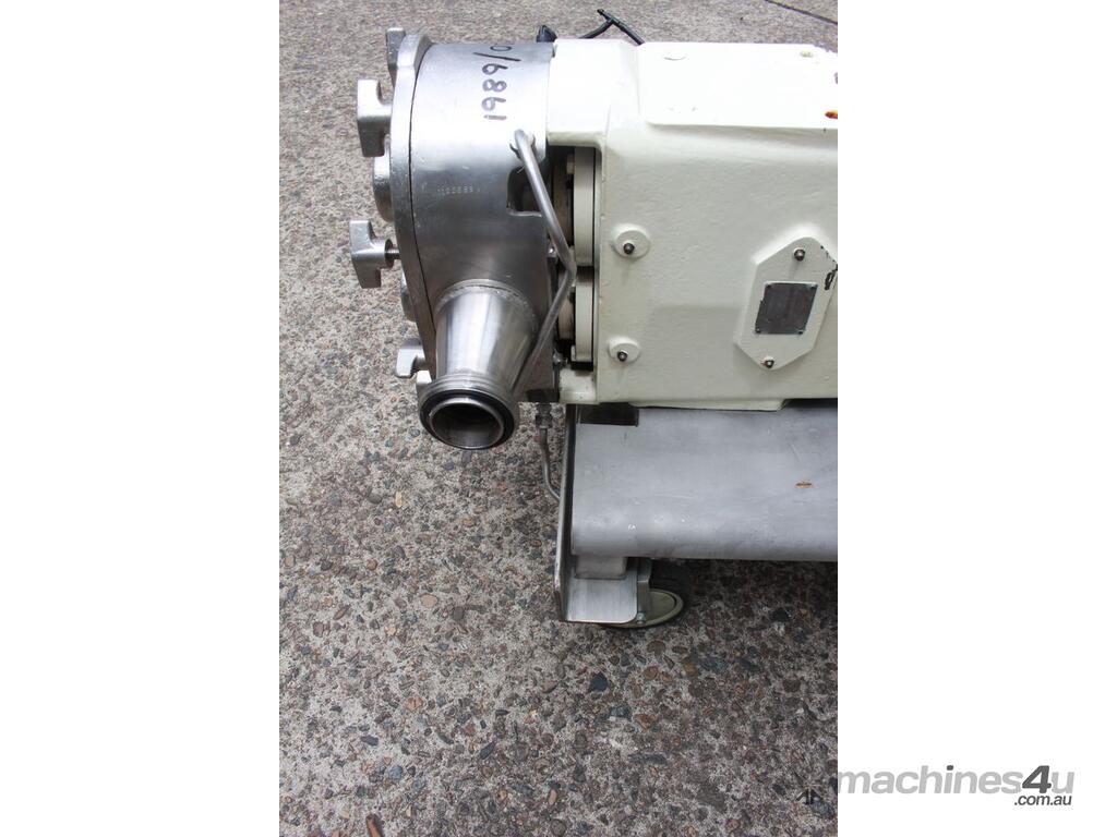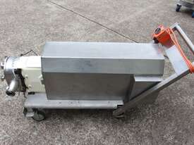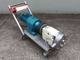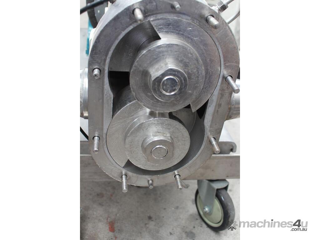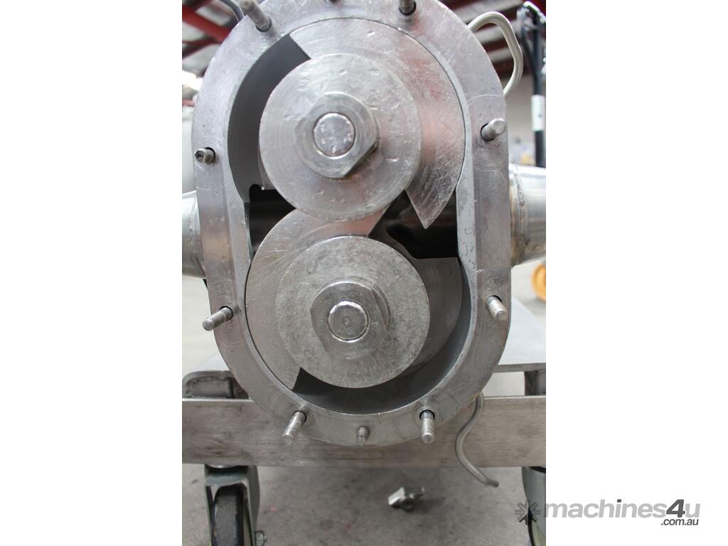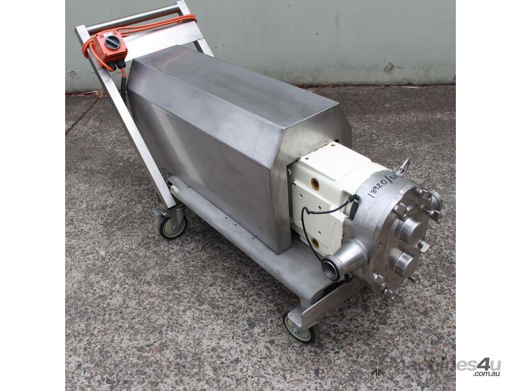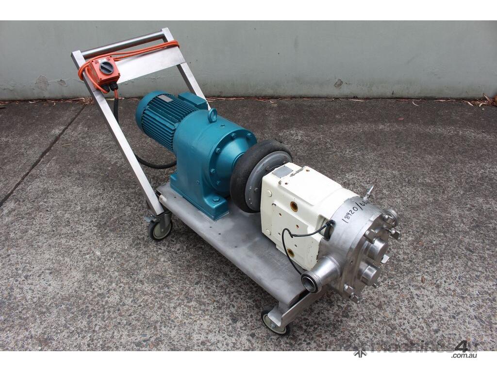 Positive Displacement Lobe Pump, "Waukesha" Sanitary Pump Size 130, 50mm inlet and outlet, Stainless Steel wetted parts, double flush seal, 160mm dia double chamber, driven by a 5kw three phase motor geared down to 78rpm, pump is bolted on a stainless steel trolley with stainless cover as well as an on/off switch
