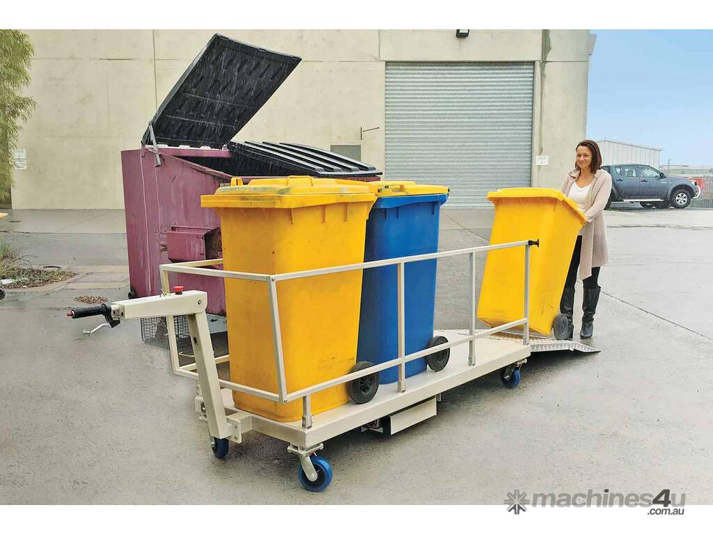 A custom-made, self-powered wheelie bin trailer designed to transport multiple wheelie bins.