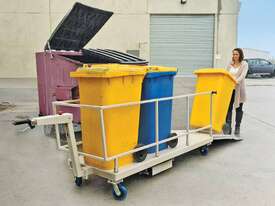The trailer is powered by its own on-board battery, making it an efficient and convenient tool for transporting bins.