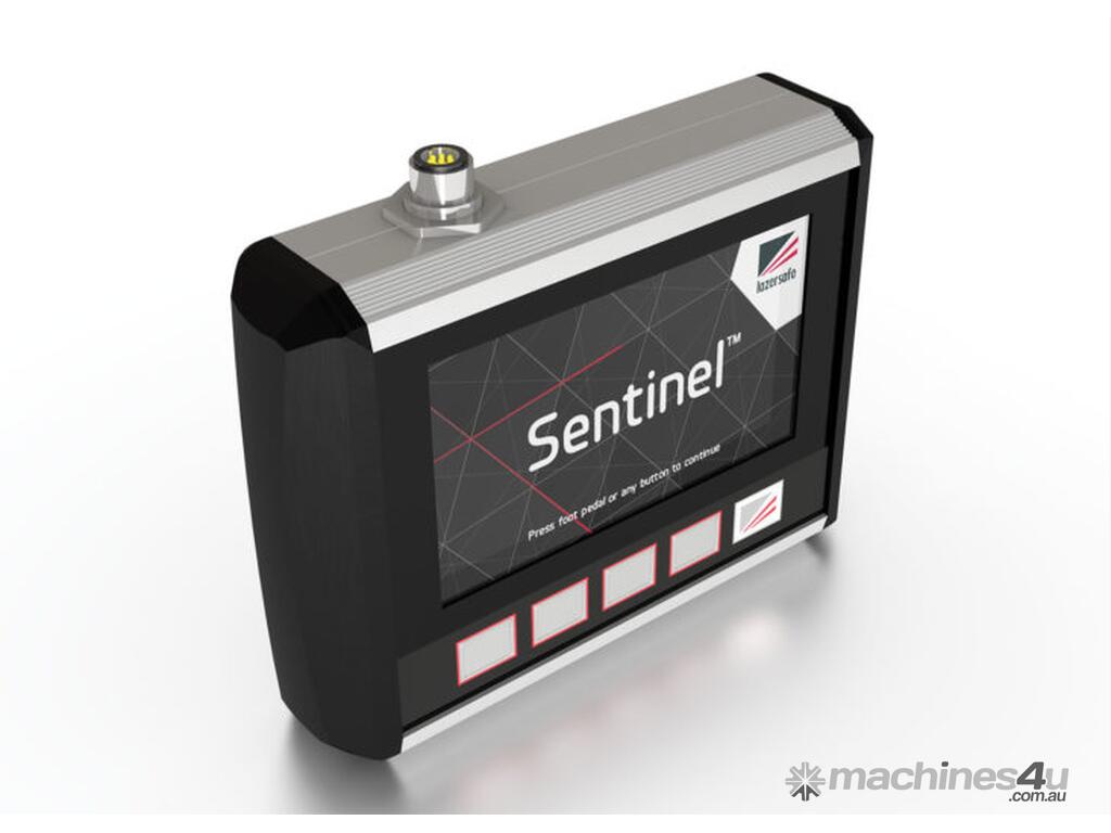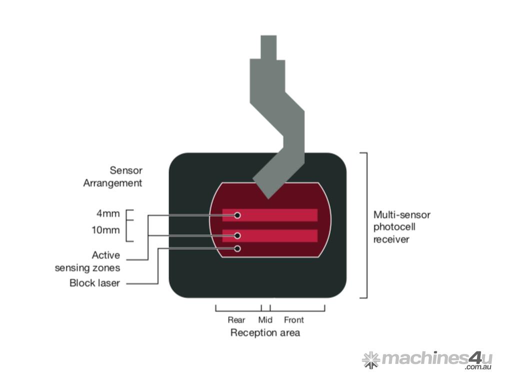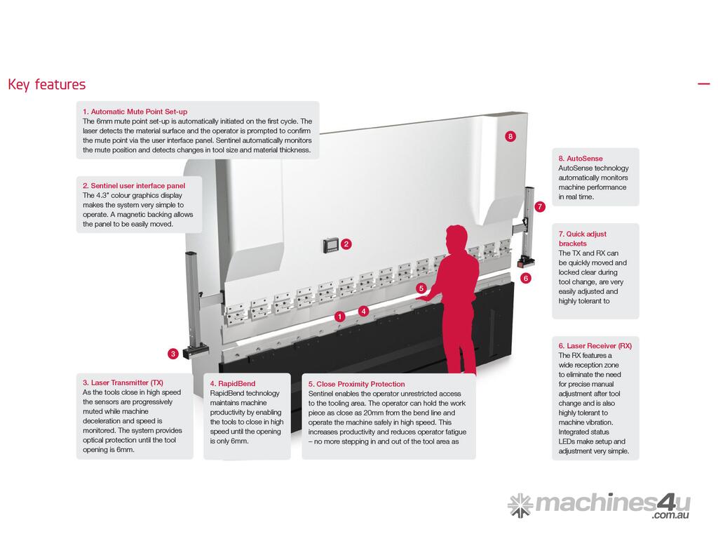 The Sentinel guarding system features a laser transmitter and receiver that are mounted to the upper beam of the press brake. A continuous block laser field protects the zone  below the punch tip allowing the operator to hold the work piece as the tools close at high speed. If an obstruction is detected the machine is automatically stopped.