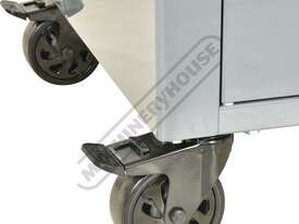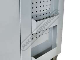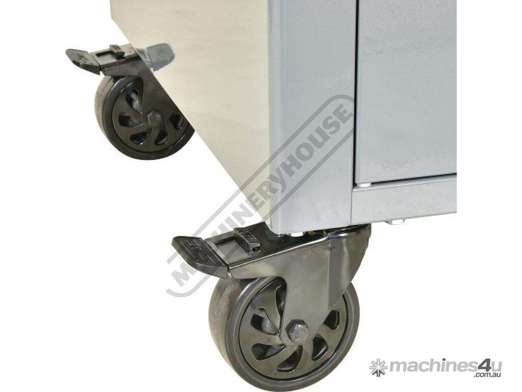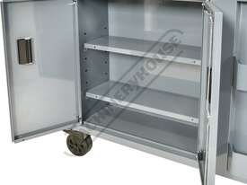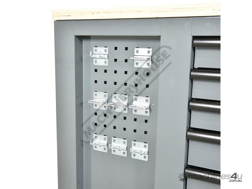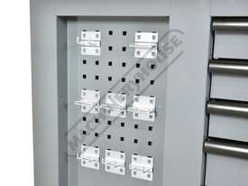 Stacked with clever storage solutions, including a hard wooden bench top, ten drawers, a cabinet with adjustable shelving, adjustable hanging hooks and side storage holders. Of course, like all serious tool cabinet solutions it features soft push-to-close drawers using ball-bearing slides to ensure smooth operation, safety lock latches & foam liners for each drawer, a large handle and oversize castor wheels will make pushing this mobile work station easy.