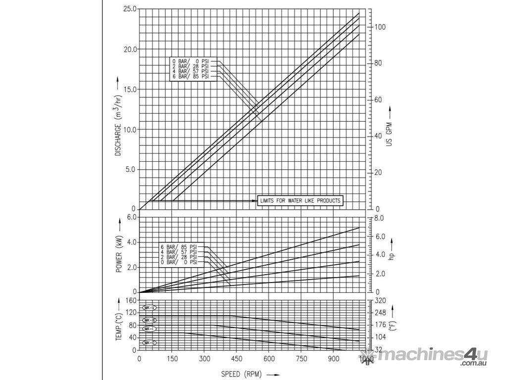 Helical rotor pump (Progressive cavity pump) 3 Phase, 1.1kW, 415V, 1440 RPM Electric motor with gearbox. Output speed: Approx 380 RPM Inlet/Outlet: 2.5 Inch Approximate Discharge: 9 m3/hr 0 BAR or 6.5 m3/hr 6 BAR. (Please see attached performance curve for more information) Unit in good condition and runs well. 2 Units available, price per unit.