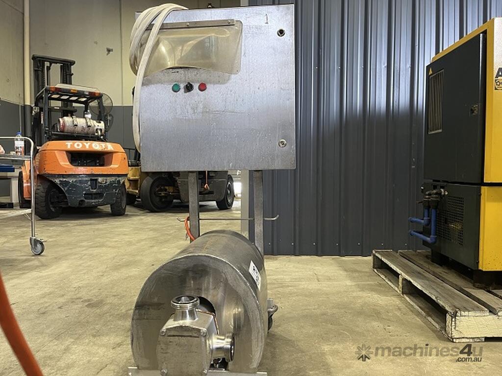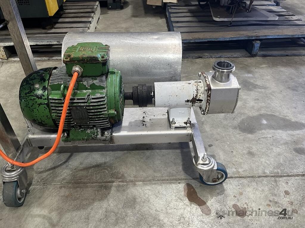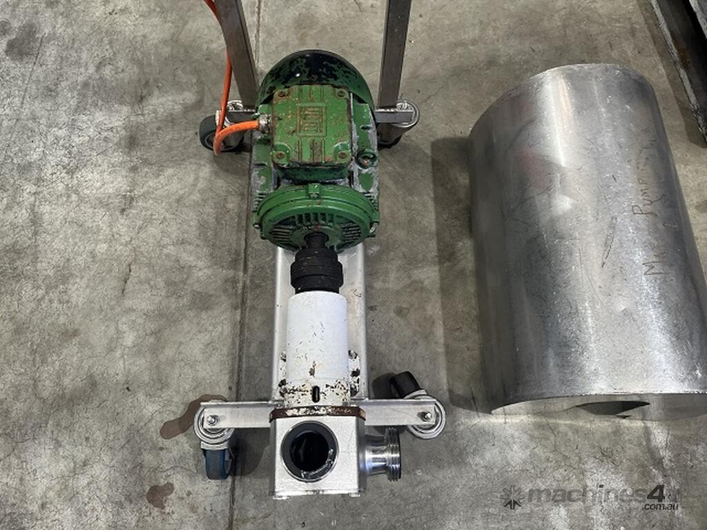 Pump, Brand: Jabsco, Model: PFLOPED370RJT, Inlet: 50mm Dia, Outlet: 50mm Dia. Unit is a stainless steel positive displacement Jabsco pump. Unit has a rubber impeller, driven by a (1.5 Kw 715 rpm, 415 V) electric motor. Pump was previously used on mayonnaise. Pump mounted on stainless mobile trolley with control panel.