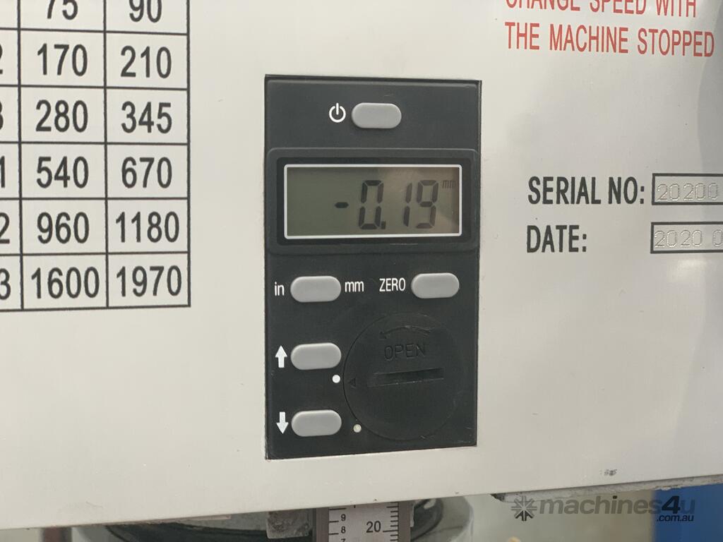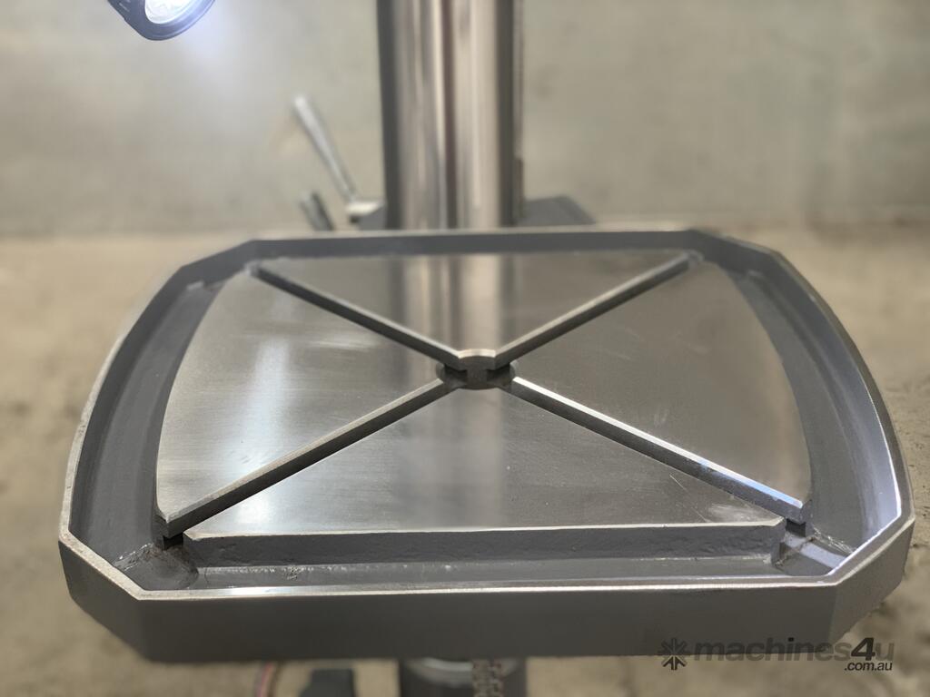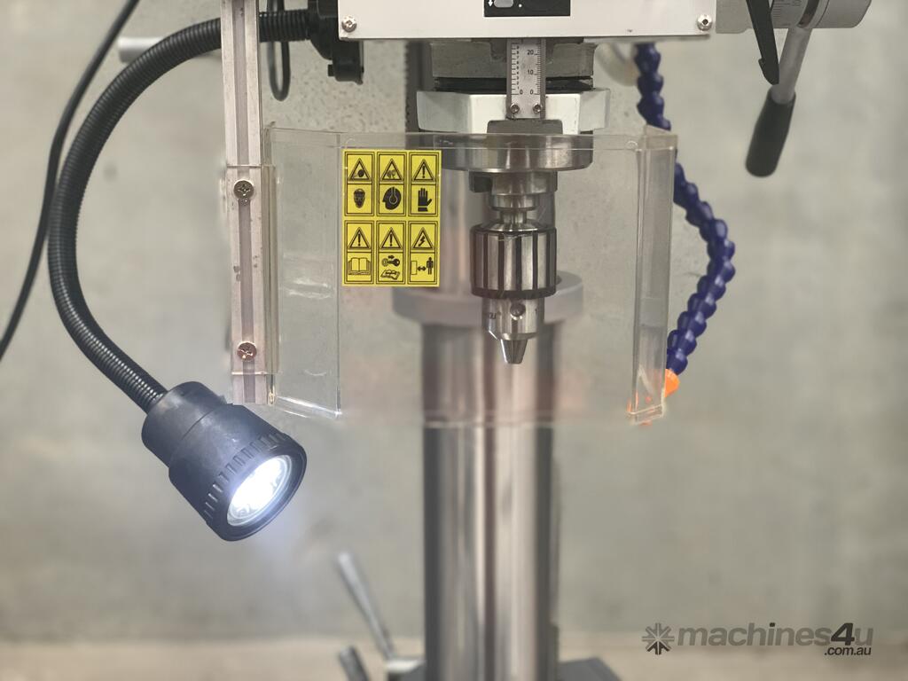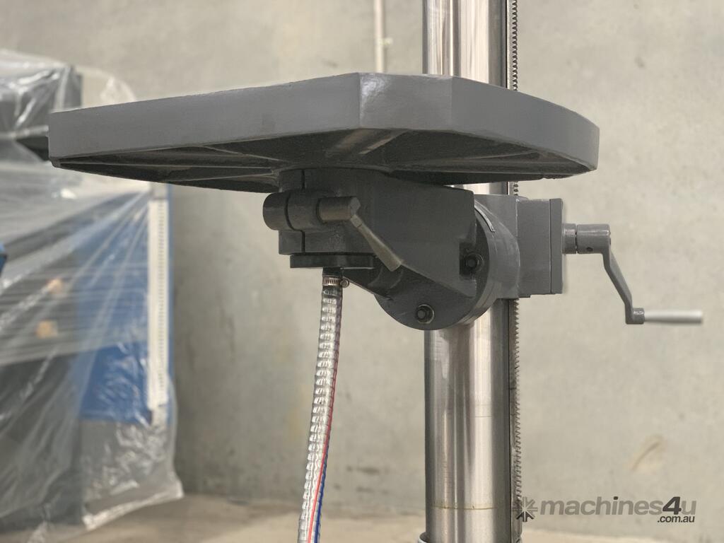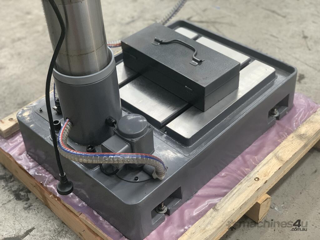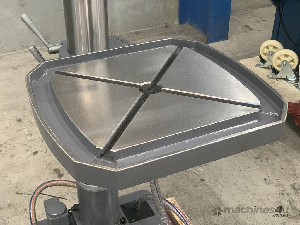 This is an excellent buy in a heavy-duty geared head Drill Press. Equipped with a large tee slotted table and power feed, this machine is robust enough for milling, drilling and boring. And the head is adjustable on the column! Head also swivels left and right. Tapping switch for easy operation. This feature expands the capacity of this machine. You can also change speeds quickly and easily. Equipped with a drawbar for threaded end-mill tooling. Wow, on top of this - Coolant.. what a winner.