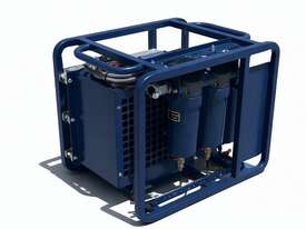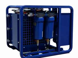Its dual filtration system combines a cyclonic filter, which eliminates 80-90% of moisture, with a particle filter that
