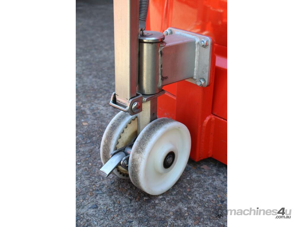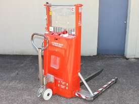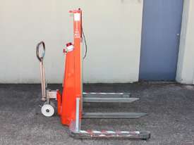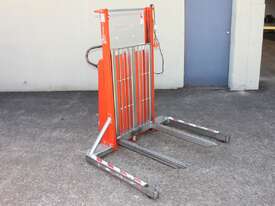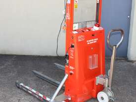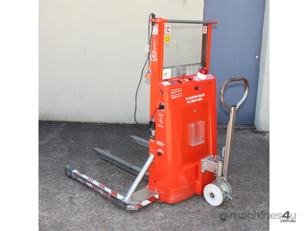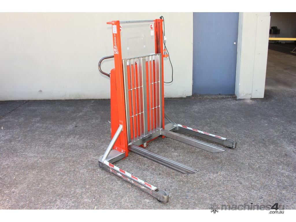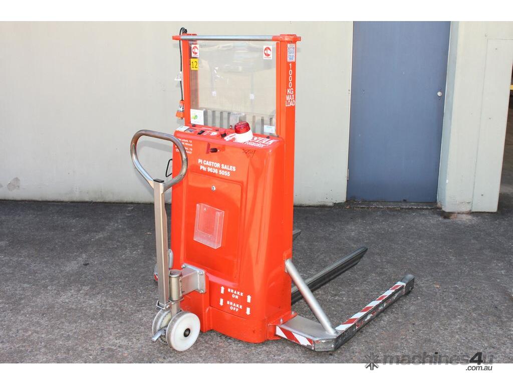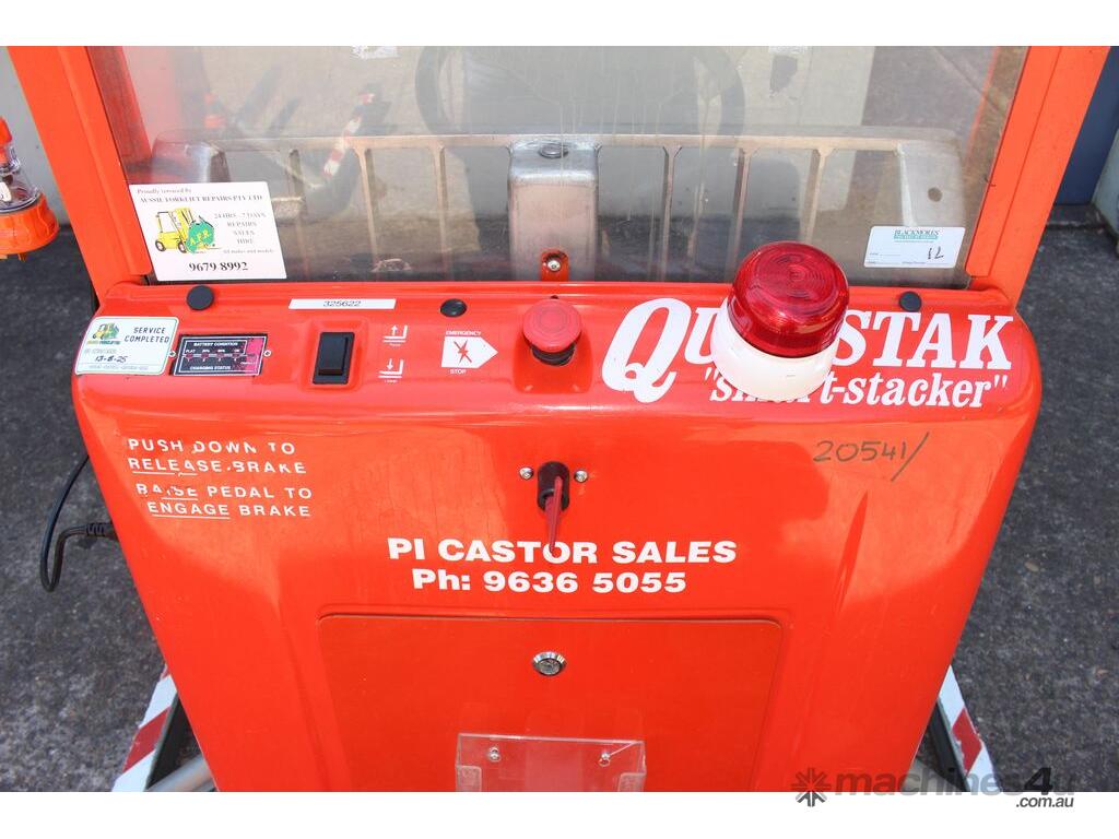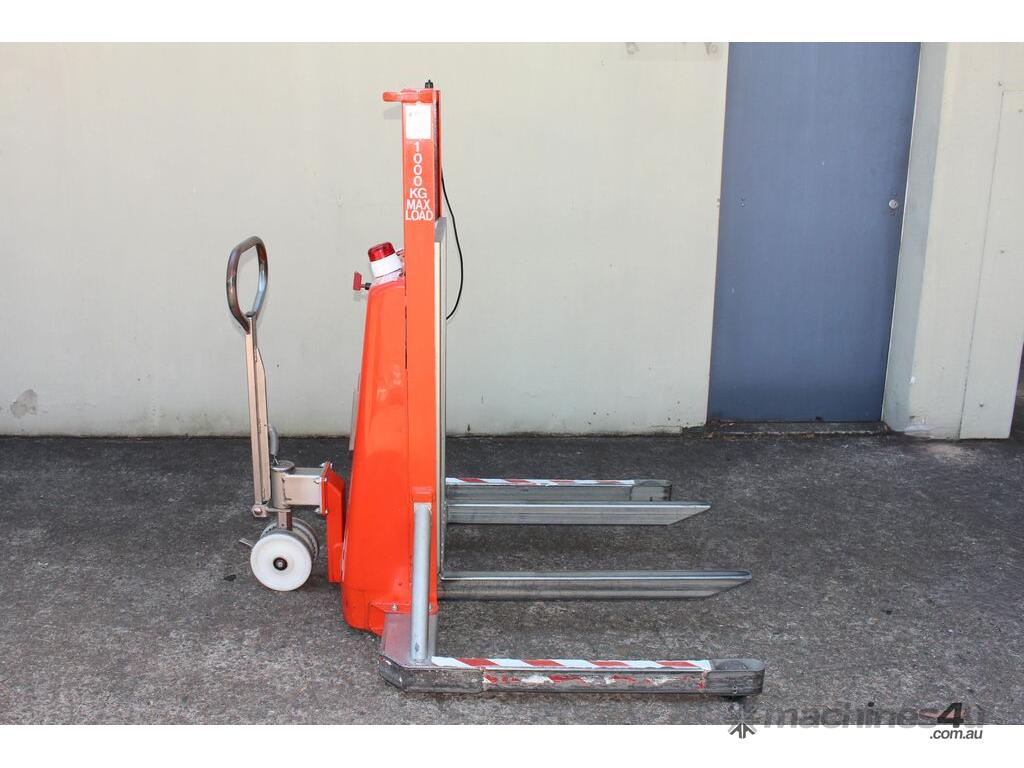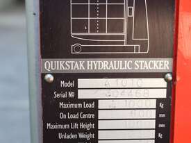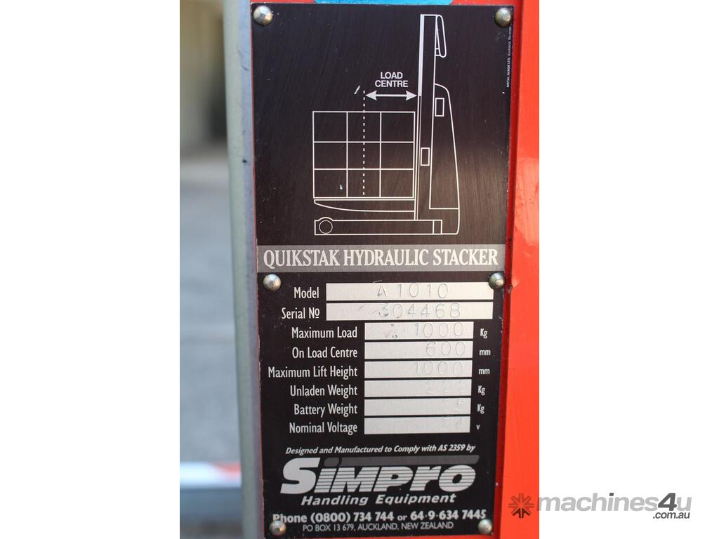Quikstak Hydraulic Stacker, "Simpro" Model A1010, automatic and manual pallet leveling, max. load capacity 1000kgs, max. lifting height 1000mm, battery operated, single phase, manual push