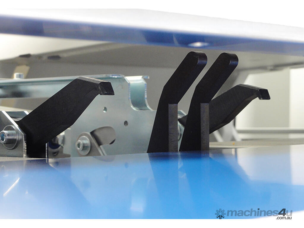 The squaring fingers automatically pop-up from the work surface. Their funnel shape and 80 mm height insure that even wavy blanks are easily squared.