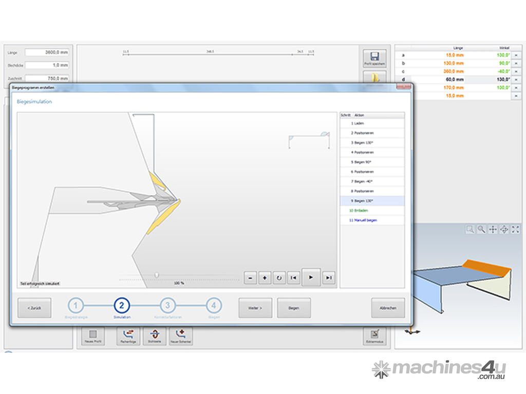 The operator draws the profile of the multi-touch monitor. The software automatically programs the part, and suggests several folding strategies. The operator selects a folding sequence and the control simulates the entire program cycle in either a 2D or 3D view.