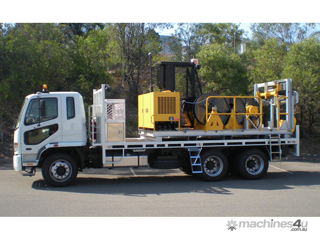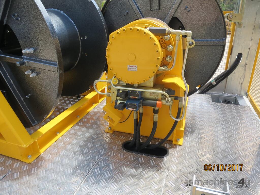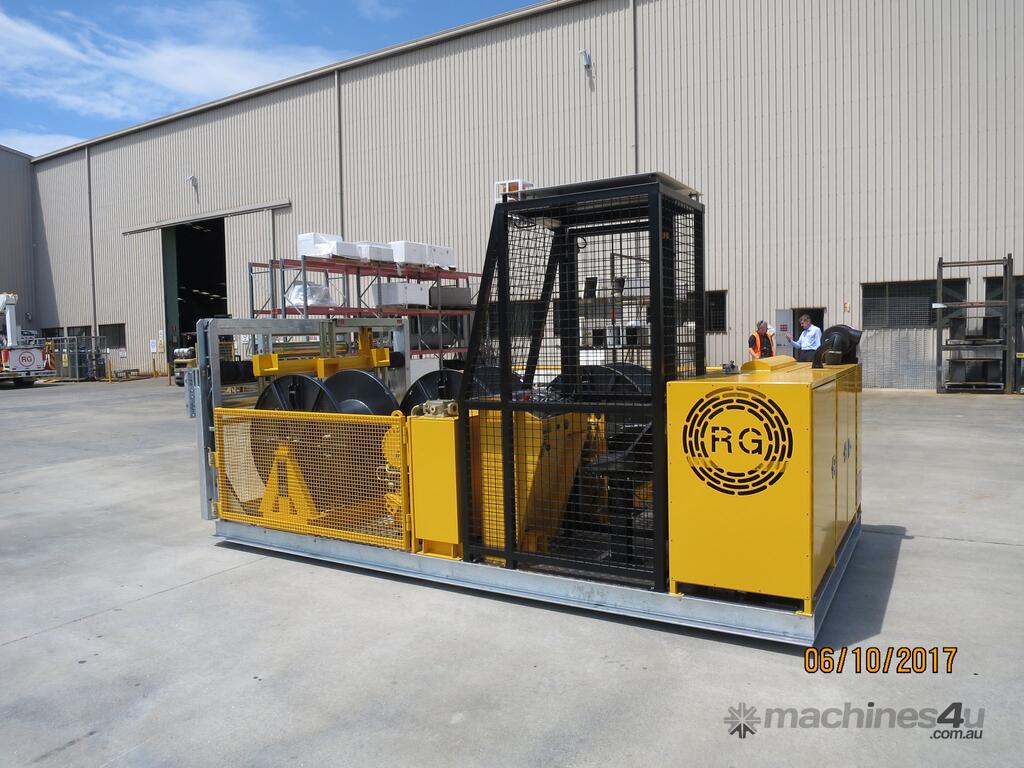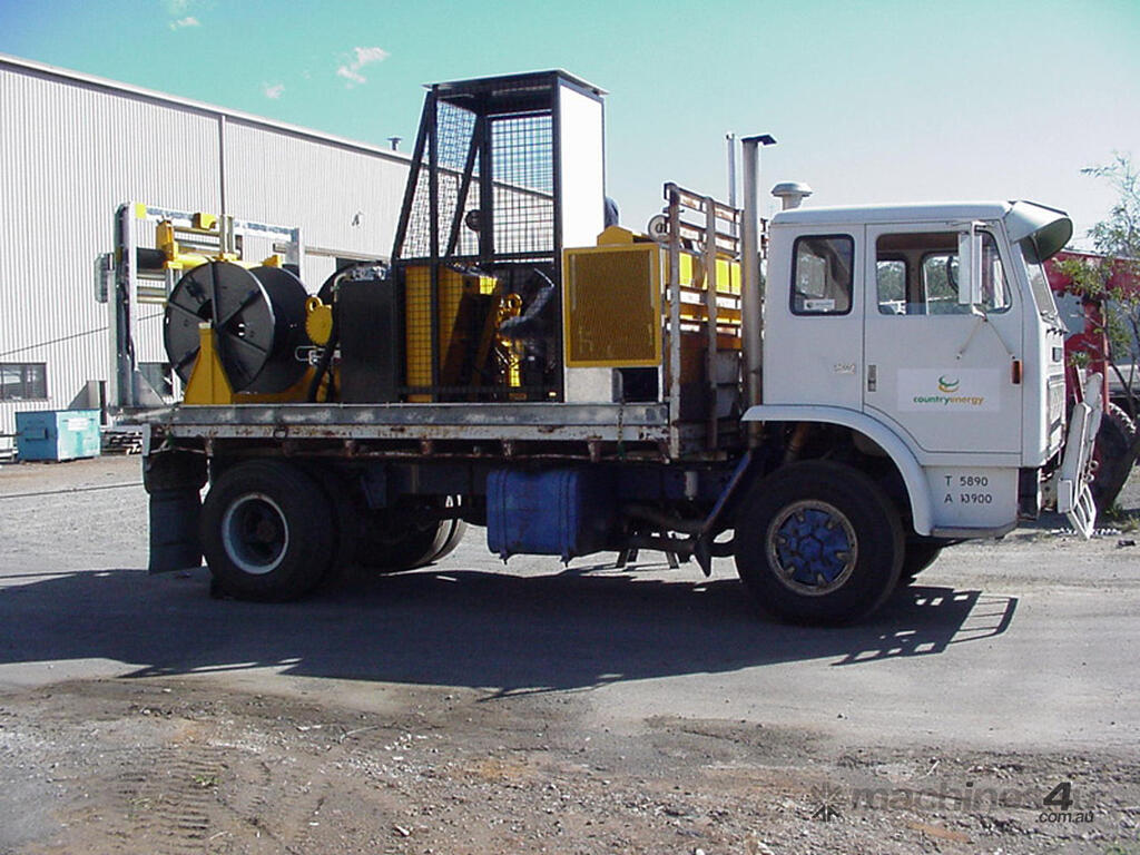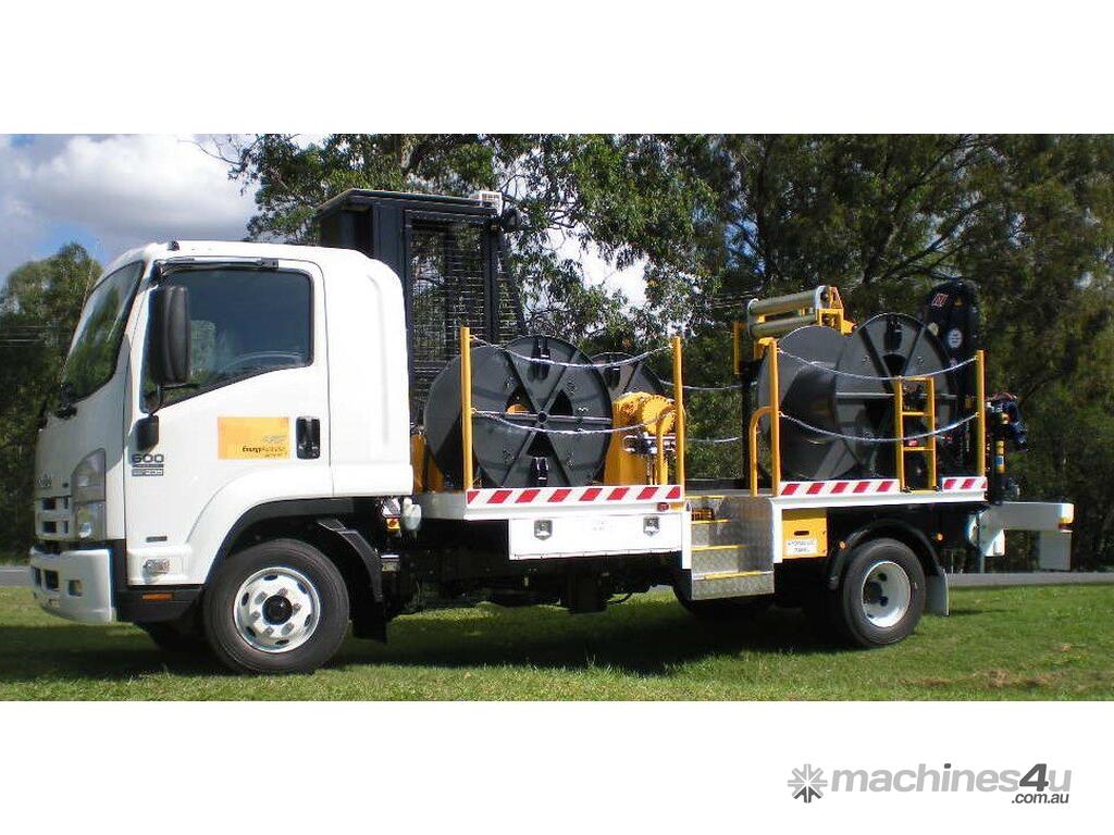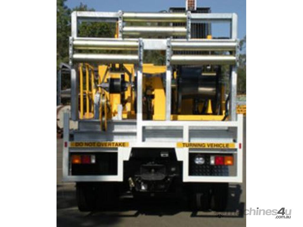 The drums are split-type metal construction and can be easily removed from their carriers. One fixed type heavy duty drum for hauling cables at 25kN line pull is also provided. The winch is provided with a load monitoring system that indicates line pull. The unit has an operator enclosure manufactured from wire mesh and has its own power pack. The winch unit is skid-mounted and is designed to be put on the back of a flat-top truck using quick-release container locks.