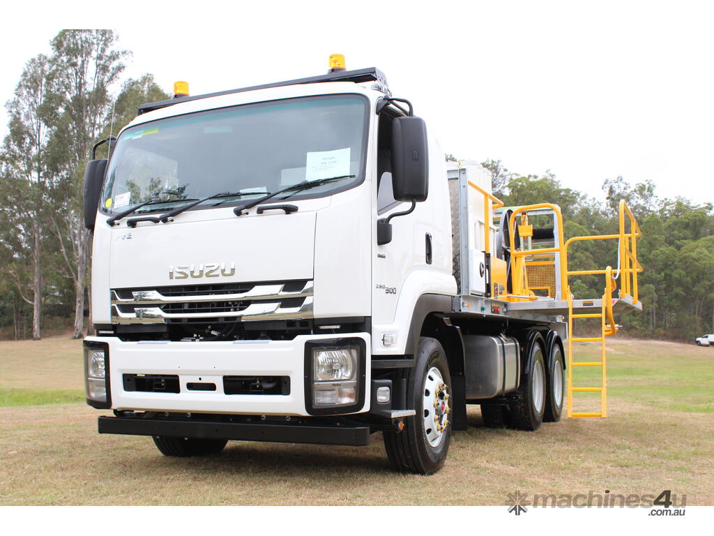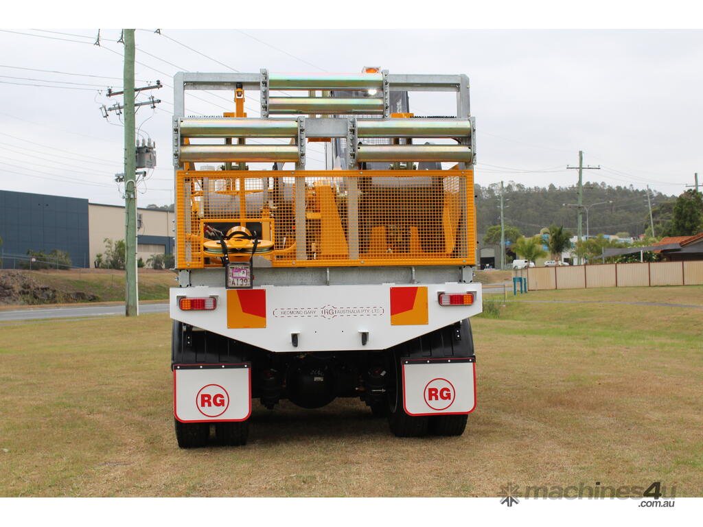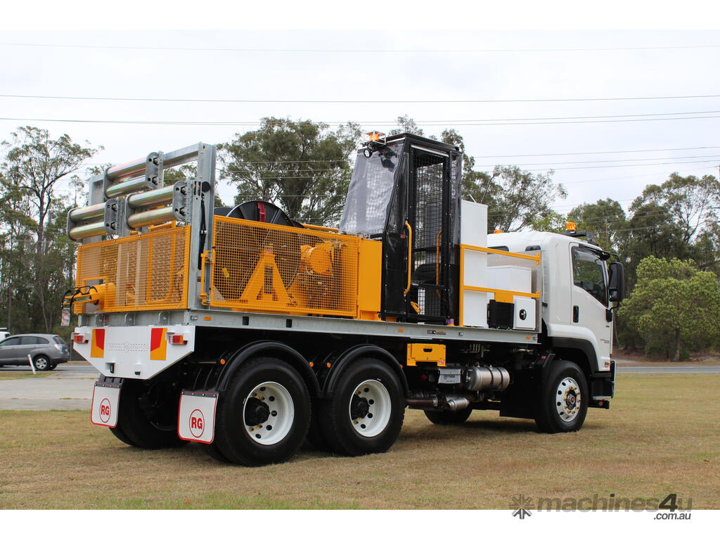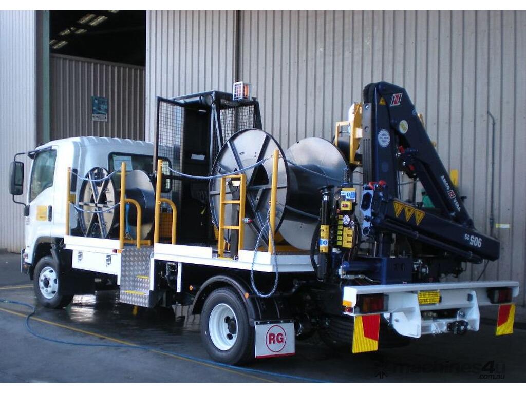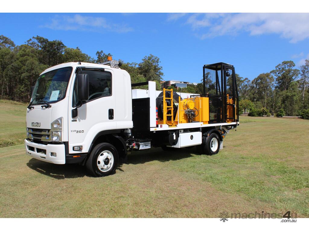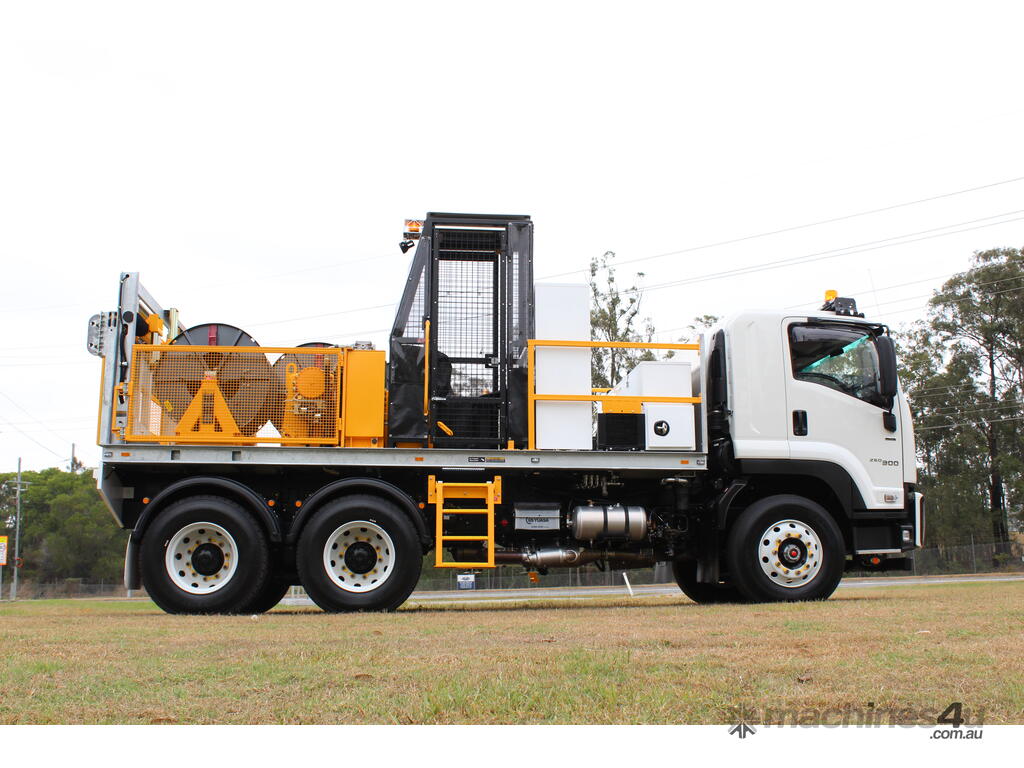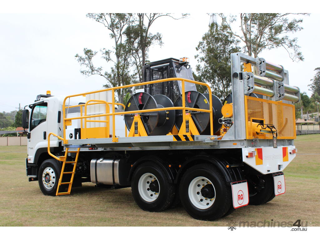 The drums are split-type metal construction and can be easily removed from their carriers. One fixed type heavy duty drum for hauling cables at 25kN line pull is also provided. The winch is provided with a load monitoring system that indicates line pull. The unit has an operator enclosure manufactured from wire mesh and has its own power pack. The winch unit is skid-mounted and is designed to be put on the back of a flat-top truck using quick-release container locks.