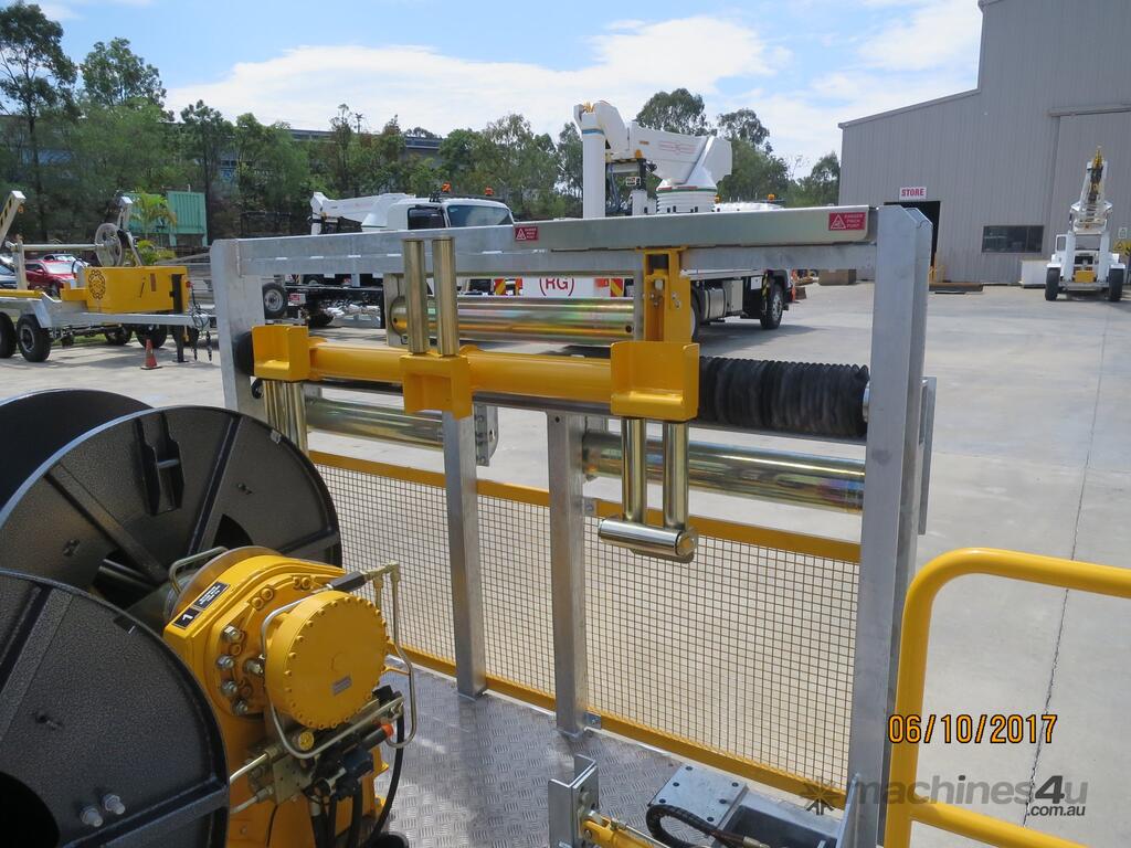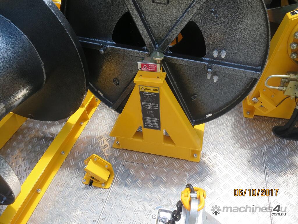 This winch can also be used for pulling underground cables in Mode No. 2. When set in this mode, the winch on the kerb side only is operated. This winch has a line pull of 25kN and hauls cable through a universal fairlead which can pull at any angle and will rotate 360°. This winch is normally used in conjunction with steel non-rotating wire cable.