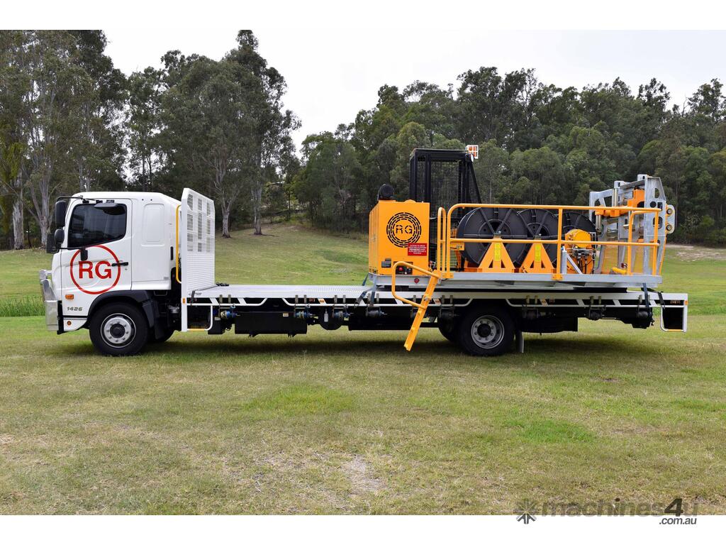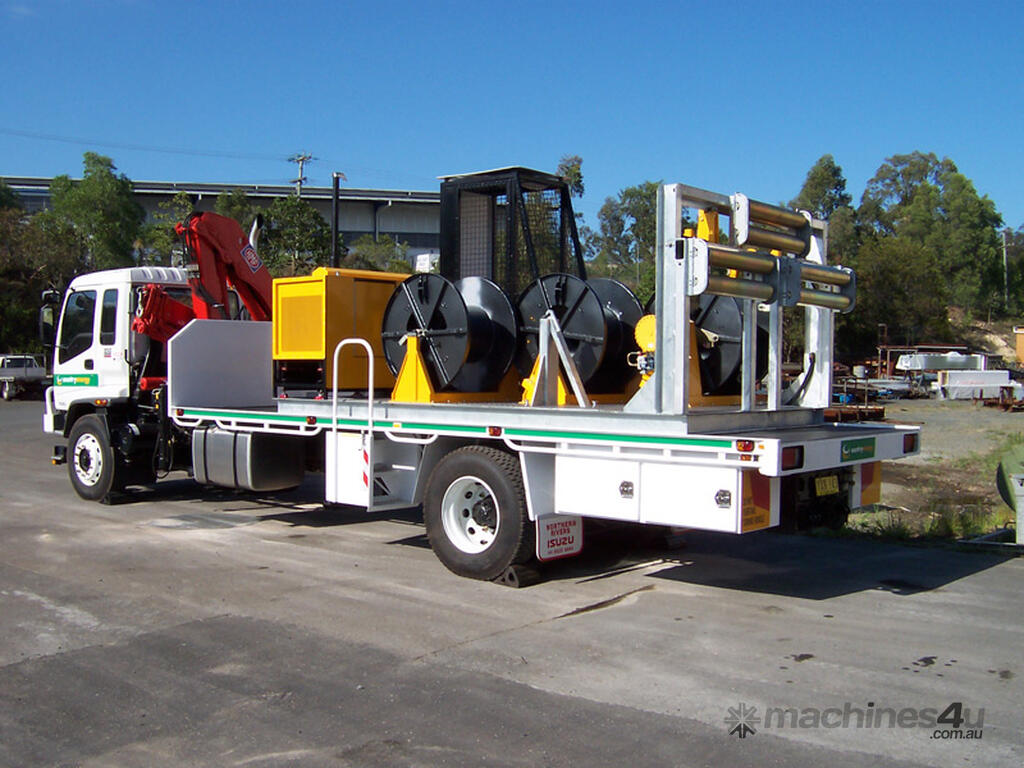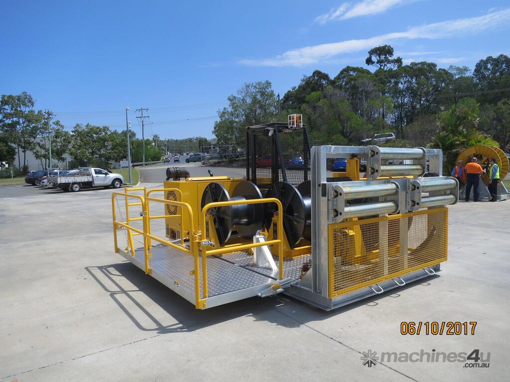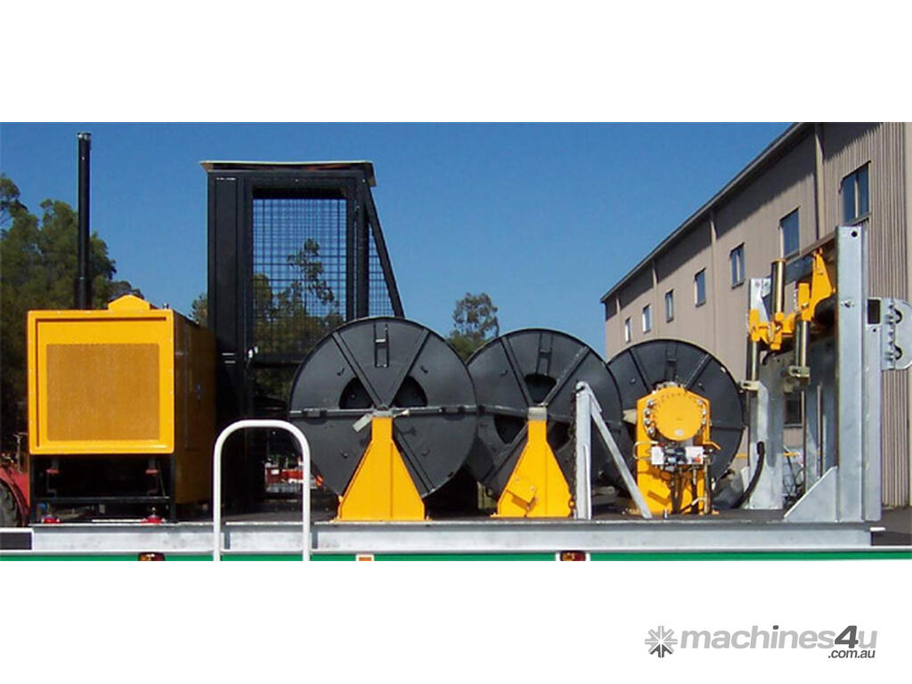 The 3-Drum recovery winch has been specially designed for pulling old overhead conductors onto a storage reel and at the same time pulling the new conductors into their place. The winch is provided with 3 storage reels and an overhead fairlead which reciprocates back and forth for layer winding onto the drums.