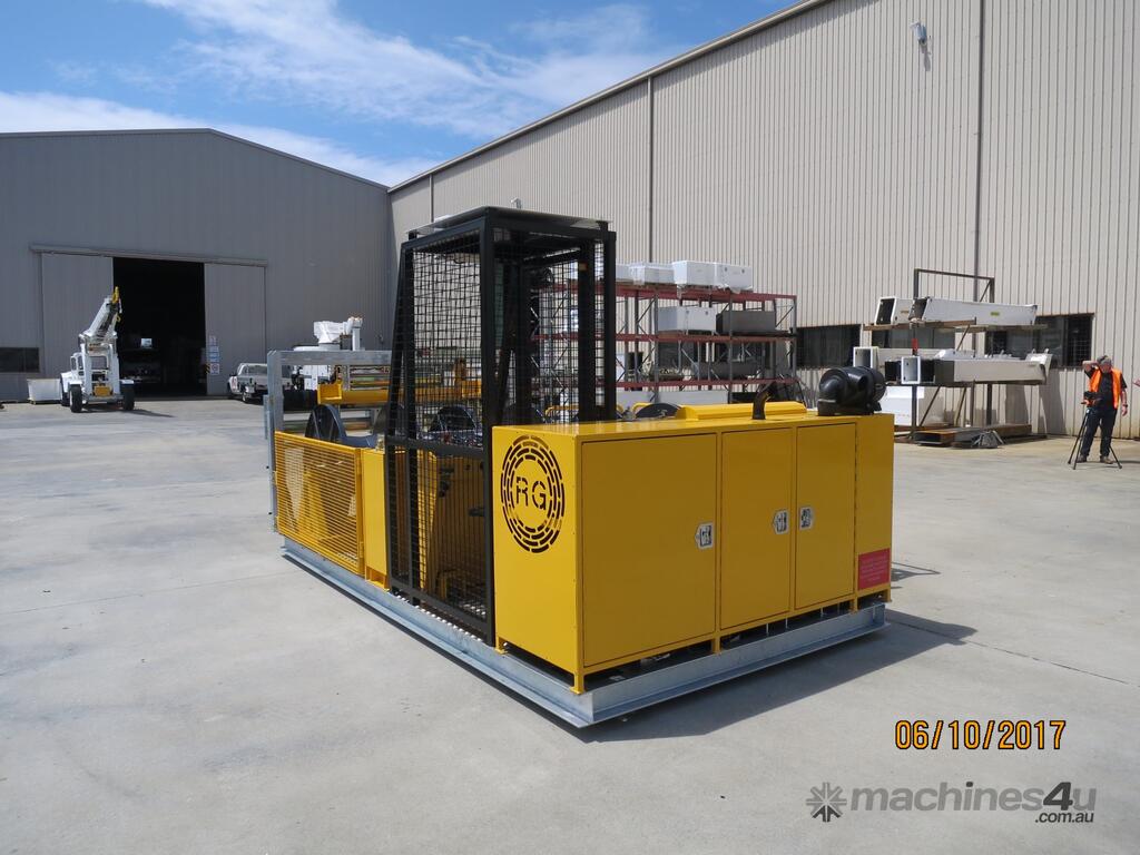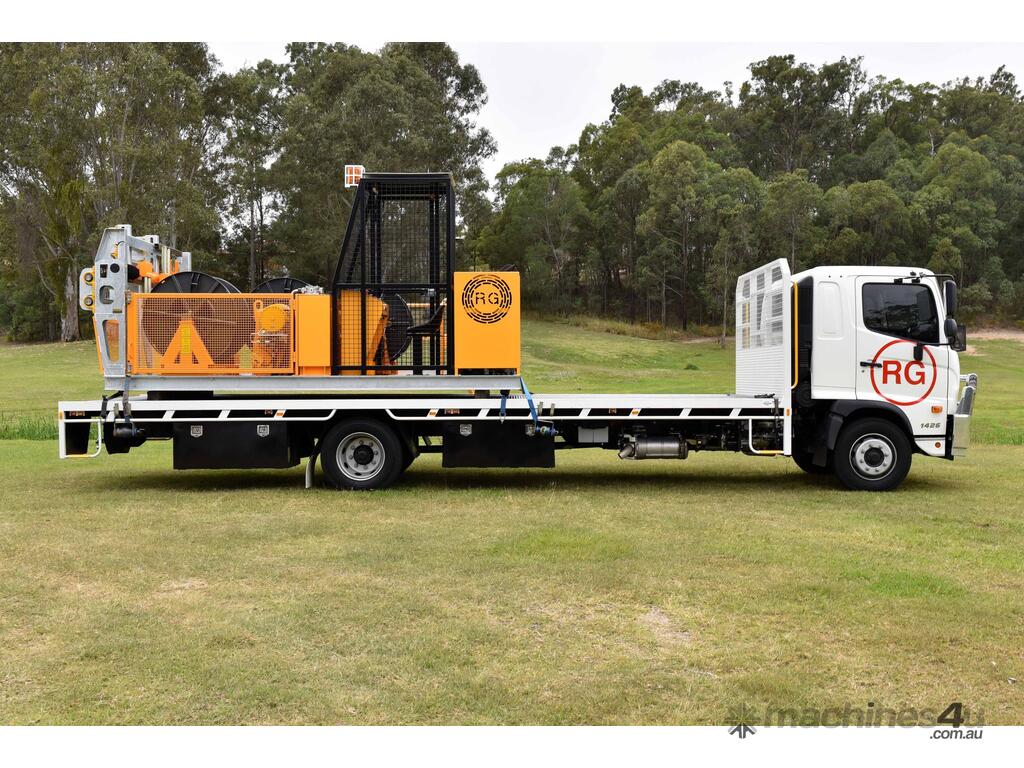 The drums are split-type metal construction and can be easily removed from their carriers. The winch is provided with a load monitoring system that indicates line pull. The unit has an operator enclosure manufactured from wire mesh and has its own power pack. The winch unit is skid-mounted and is designed to be put on the back of a flat-top truck using quick-release container locks.