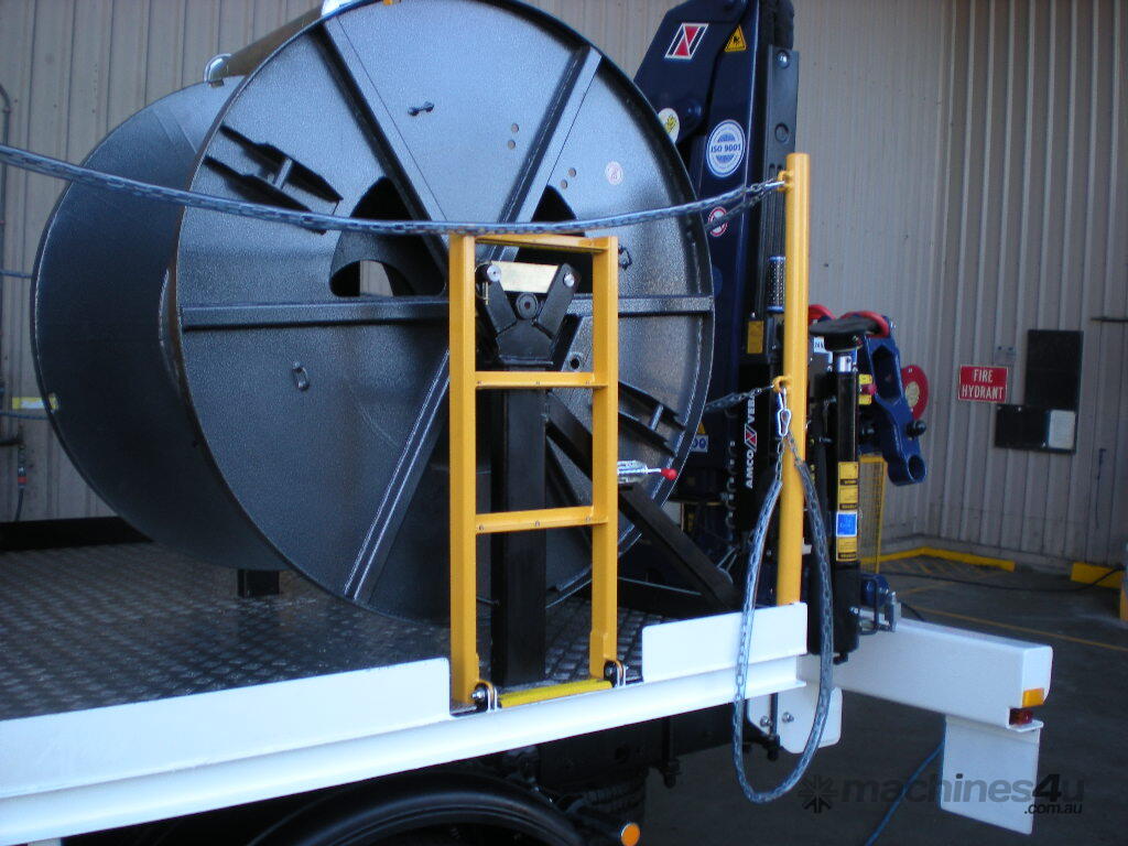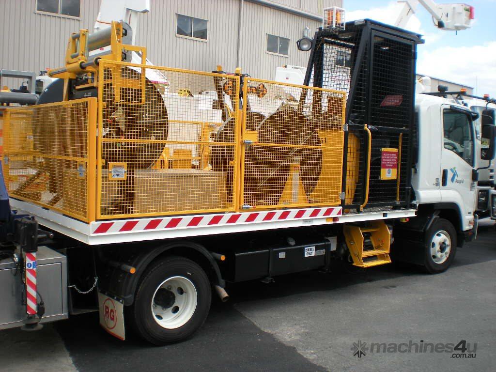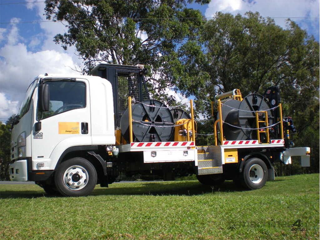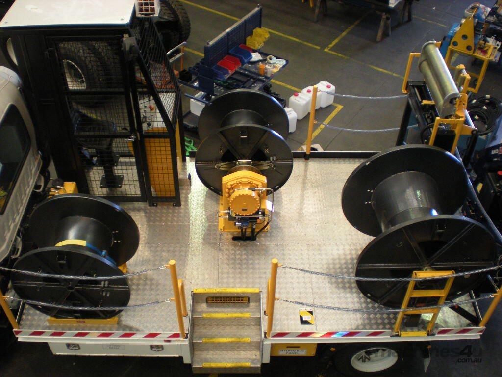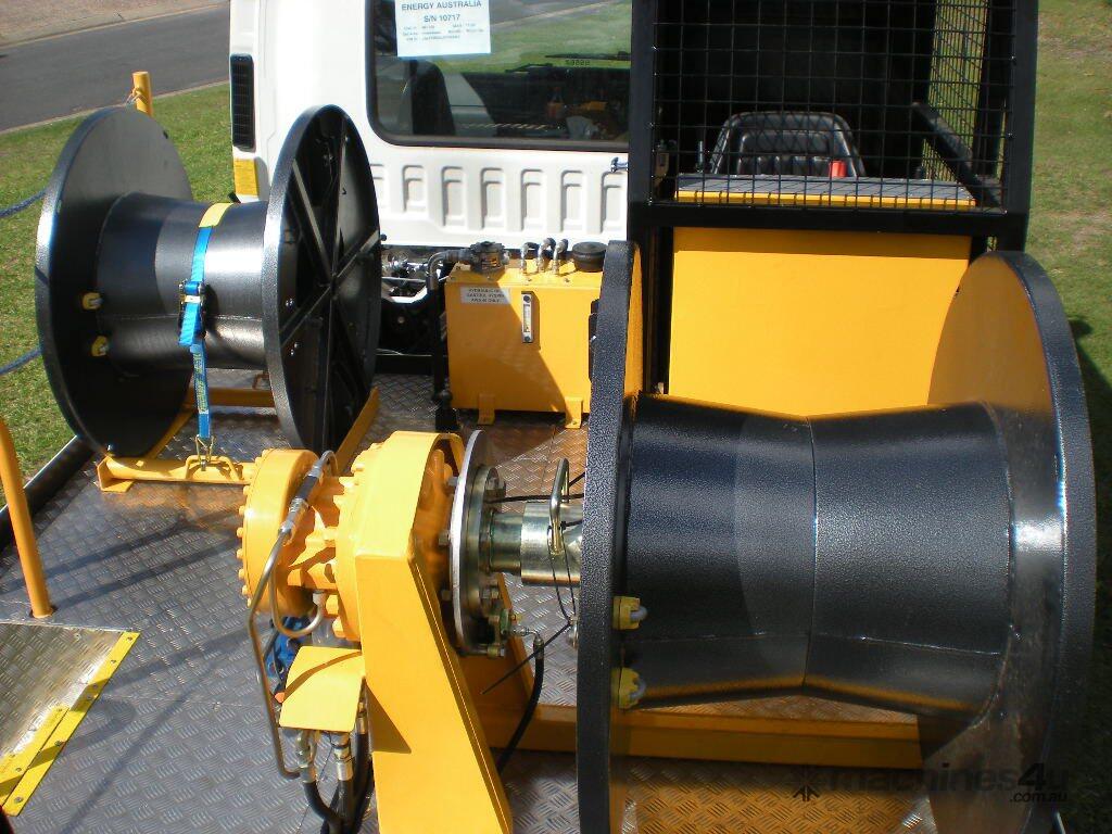 The 10kN Truck-Mounted recovery winch is designed for tension stringing of overhead cables in distribution networks. The truck is provided with a single 10kN winch with a split drum as standard. In addition, it is provided with a drum stand complete with disc brake capable of carrying a drum up to 1200mm diameter, weighing 1500kg. This configuration has been designed to operate in confined areas such as narrow streets and busy roads in metropolitan areas. The drum winch has been specially designed for pulling old overhead conductors onto a storage reel and at the same time, pulling new conductors into their place. The winch is provided with one storage reel and an overhead fairlead which reciprocates back and forth for layer winding onto the drum.