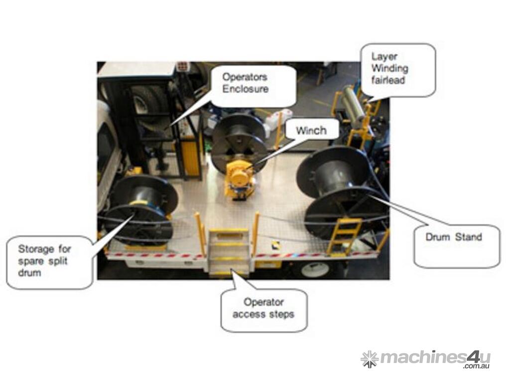 When operating the winch at 10kN line pull for re-conductoring overhead lines, the cable is run through a fairlead layer winding device and onto the split drum.