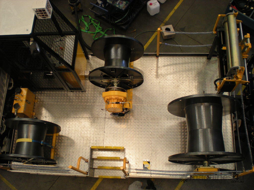 The above photo, taken looking down on the truck, shows the layout of the winch with generous access provided for operators. Chains are provided in place of fixed handrails to make it easy to access all parts of the winch using forklift or other apparatus. All hydraulic componentry is readily accessible via removable panels for service purposes.