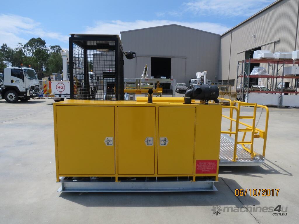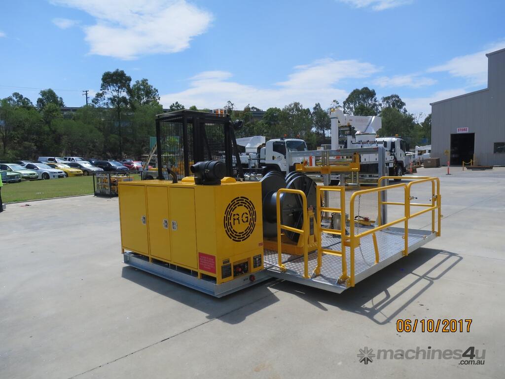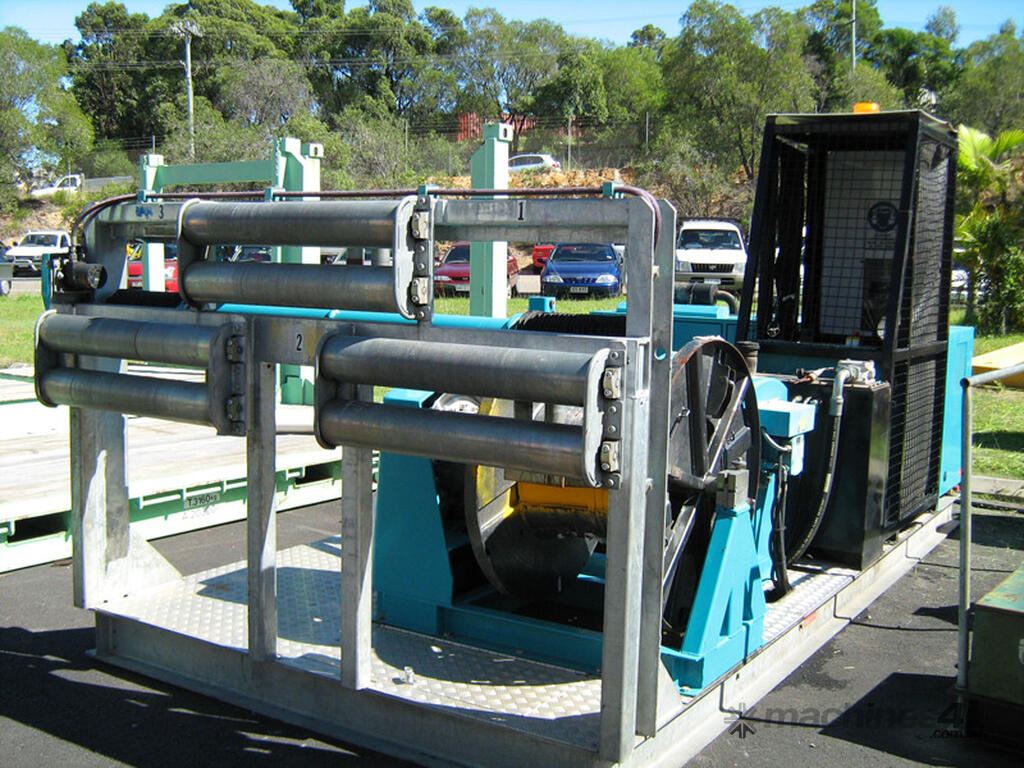 The drums are split-type metal construction and can be easily removed from their carriers. The winch is provided with a load monitoring system that indicates line pull. The unit has an operator enclosure manufactured from wire mesh and has its own power pack. The winch unit is skid-mounted and is designed to be put on the back of a flat-top truck using quick-release container locks.