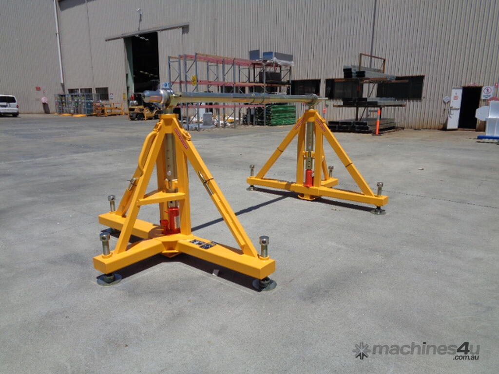 The special A-Frame design using aircraft jacks makes it possible to carry heavy drums of cable up to 30,000kg for assembly on-site. The system has two hydraulic stands - one placed either side of the drum and a special spindle consisting of stub axles either side tied together with a light-weight brace. Both stands are provided with three ball and socket feet which are height adjustable for easy setup. This frame is designed to be used on site where minimal drum handling equipment is available. Because both sides of the frame are completely independent, the drum width can be easily accommodated and drums up to 4000mm in diameter can be installed.