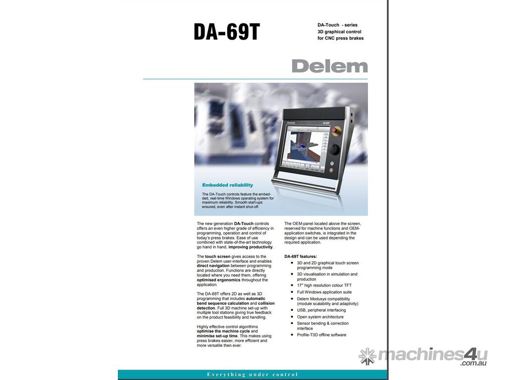 • Controller is the top-of-the-line Delem DA69T from Holland. This will future-proof your workshop with 3D Touch screen graphic programming and the ability to import CAD files.