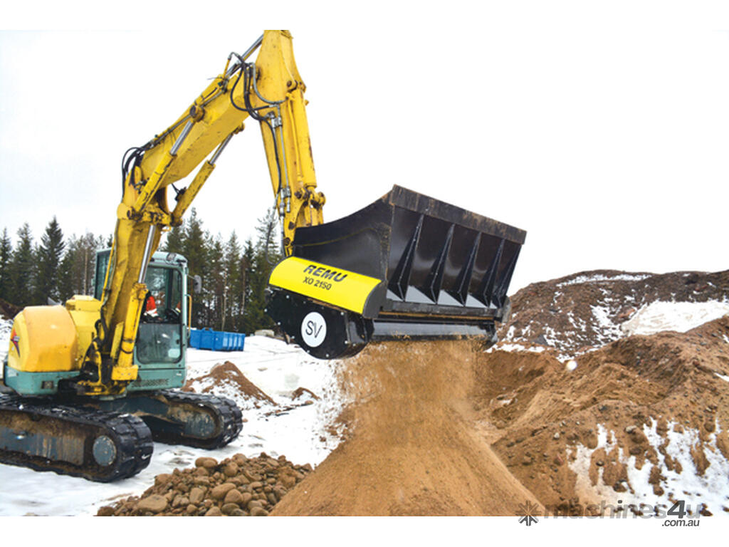 REMU XO crossover buckets can be attached to almost any type of excavator, backhoe, wheel-loader, skid-steer or tractor. Through the set-up of different rotor types and spacing of rotating blades, screening buckets can be easily adapted for different applications.
