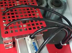 The RHINO R4000S Compact HOT MELT EDGEBANDING MACHINE has board feed system via rubber pad caterpillar track, chain driven with overhead rubber rolls
