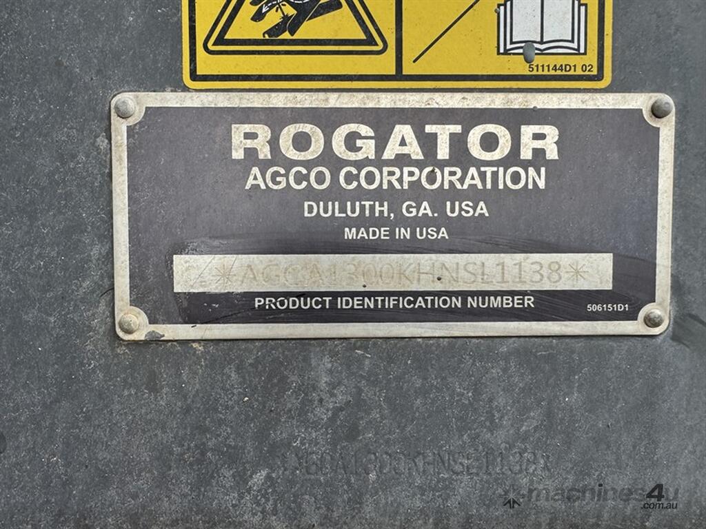 ROGATOR RG1300B SELF PROPELLED SPRAYER - 5,802 hours, 36m boom, 6,200L stainless steel tank. Cabin tidy, Trimble field IQ screen & receiver. with 36x Weed-It blue cameras on 1m spacing. 480/80R42 tyres, good condition. Serial - AGCA1300KHNSL1138. More details to come. Located Walgett NSW Contact Sandy Bailey .