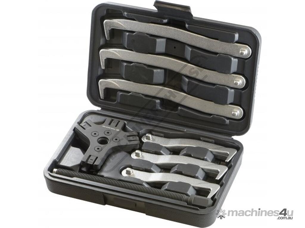 This professional quality ratcheting gear puller set jaws and thread are made from chrome molybdenum. This combination system allows 2 or 3 leg setup. Its Jaws are reversible for internal or external pulling. The Legs have a ratchet action jaw lock alignment for easy setup for removing gears etc. This gear puller set provides a variety of combinations to pull bearings, gears and seals.