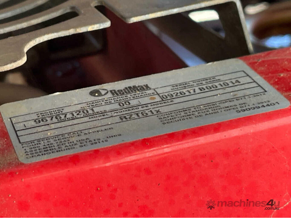 No C/P,Redmax,RZT61x,Zero Turn Ride On Mower,2 Cyl,Petrol,Odometer not visible,1364 (Hrs. Showing on Hour meter),Colour: Red,Unregistered,Serial No: 092617B001014,Sold with No Plates
