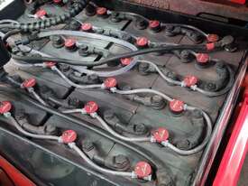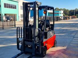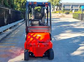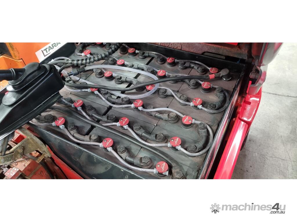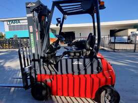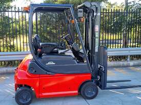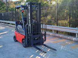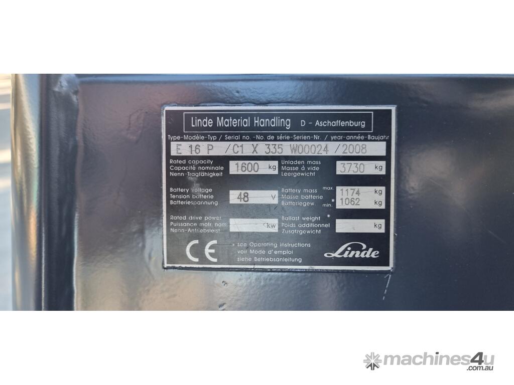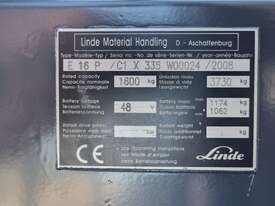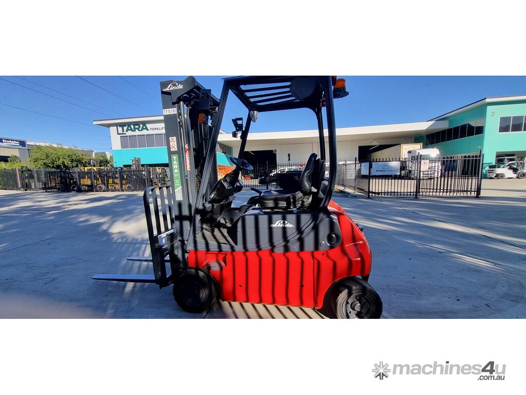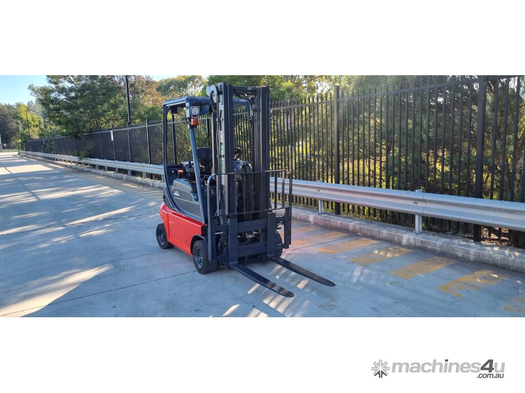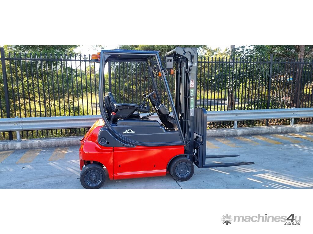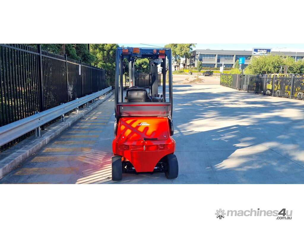 Refurbished Linde 1.6t battery electric 4-wheel counter balance with 3 stage container mast. Fitted with side shift, solid puncture proof tyres, hydraulic fingertip levers, roof cover & full lighting kit.