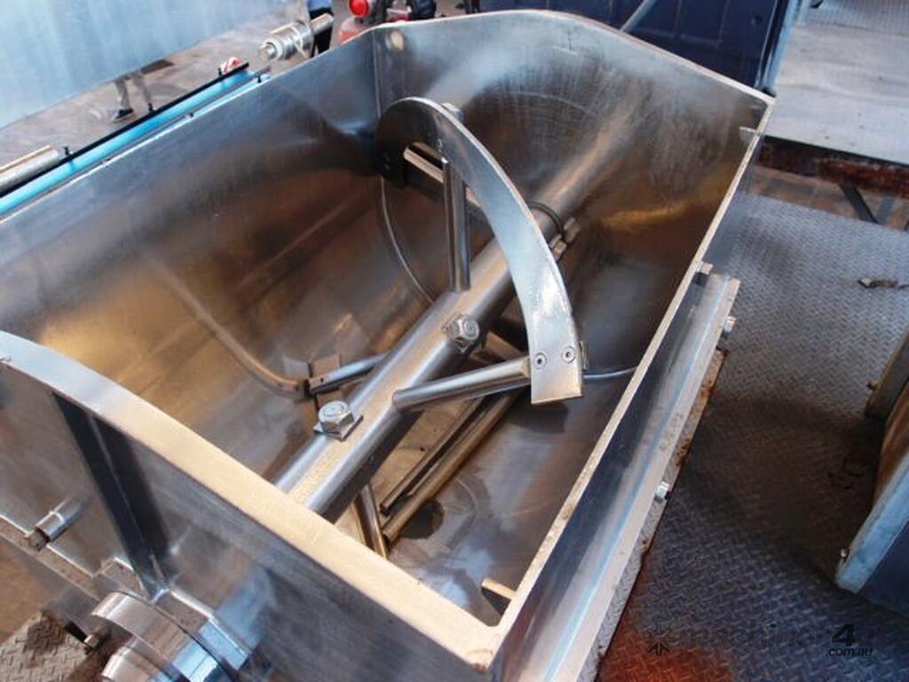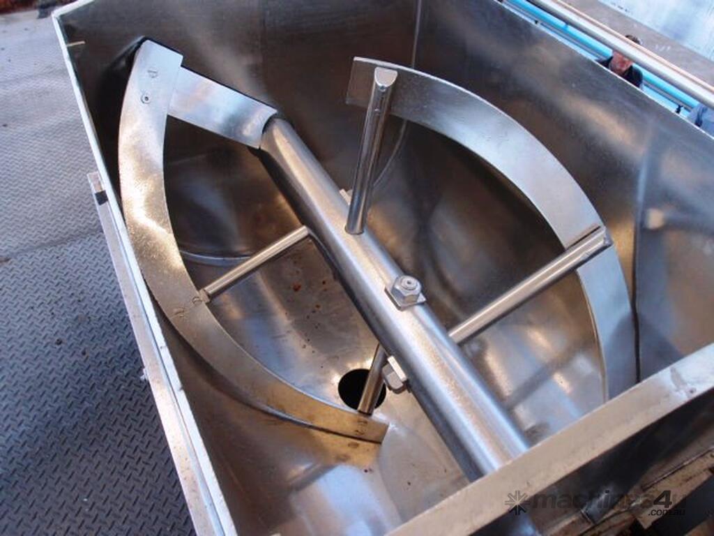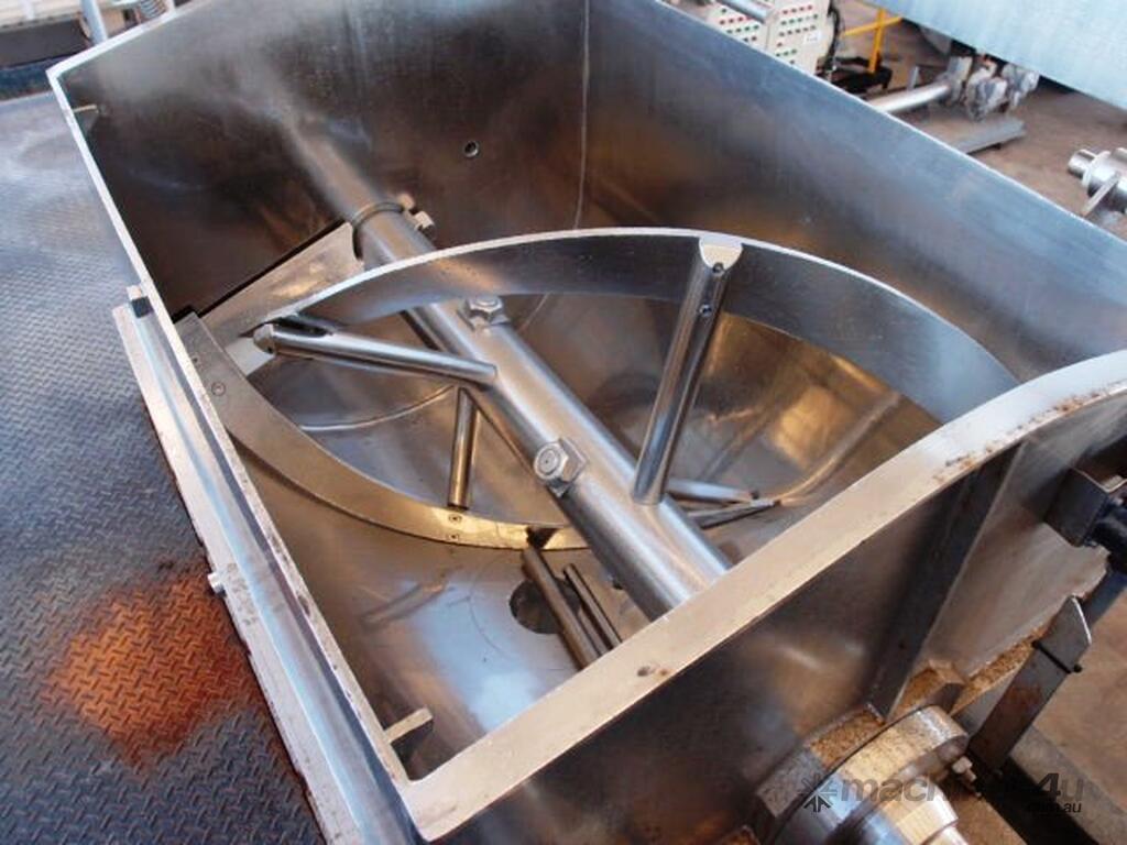 Unit is a stainless steel heavy duty jacketed single ribbon mixer.