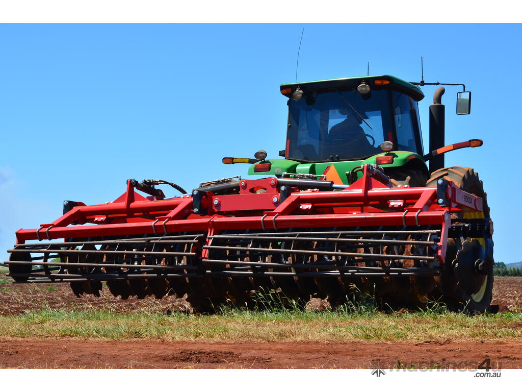 Features hydraulic depth control for easy adjustment and is heavy enough to penetrate hard soils and provide a uniform seed bed and is versatile enough for both primary and secondary cultivation purposes.