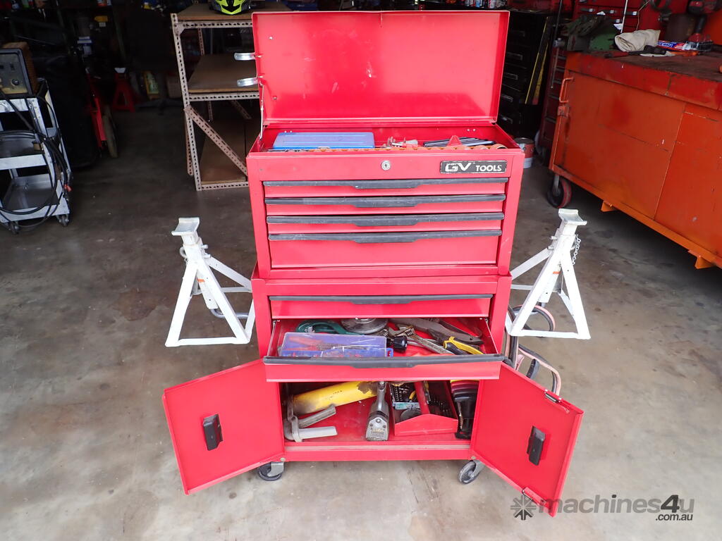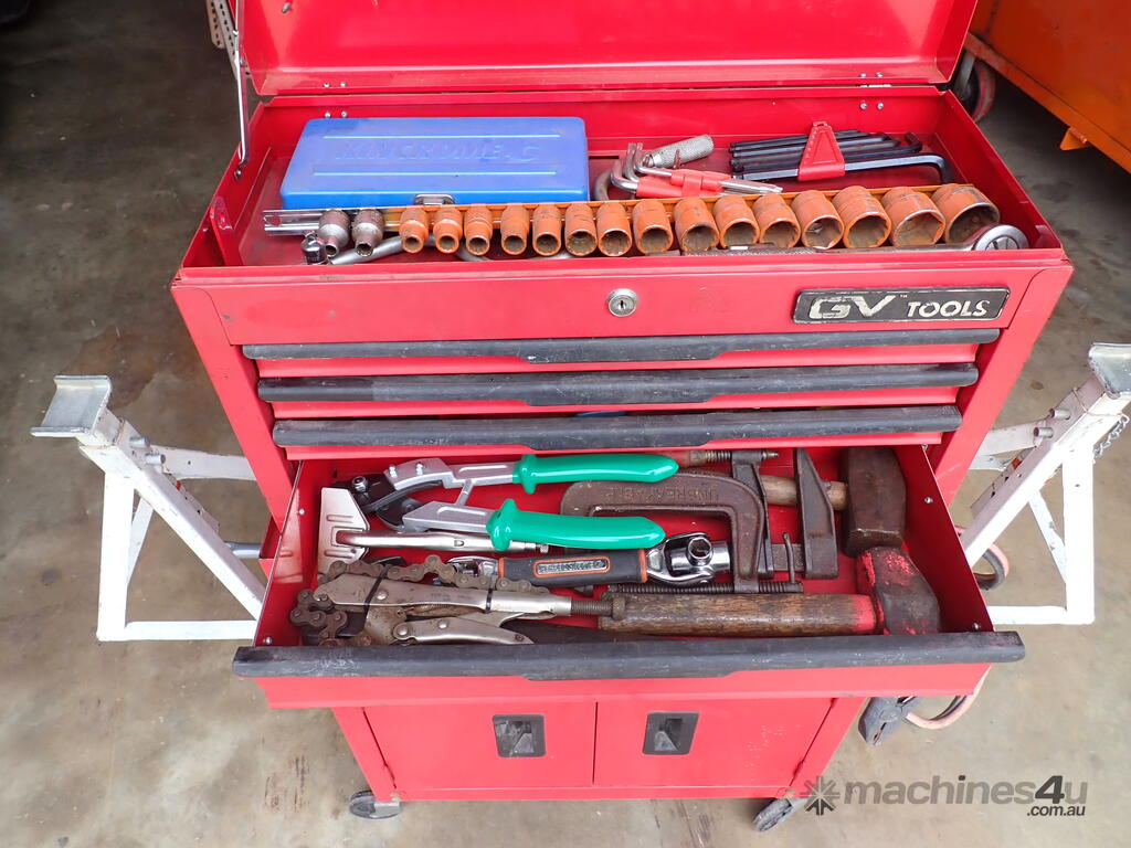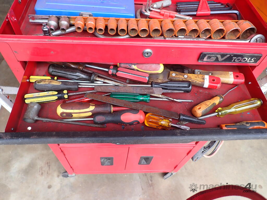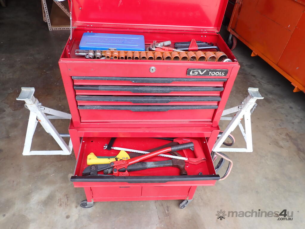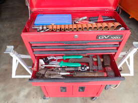 Rolling toolbox/cabinet with tools, GV Tools brand box, small 6 drawer and 2 door, with tools including socket sets 1/4 & 3/8 & 1/2 inch drive, spanners, screwdrivers, hammers, allen keys, pliers, cutters, bolt cutters , cable cutters, wiring crimp kit, 1/2 inch air rattle gun, files, saws, grease gun, torx bits & keys, jumper leads, pair of small stands, etc., in good condition.