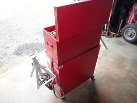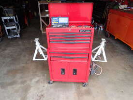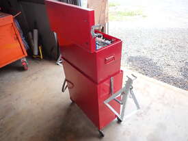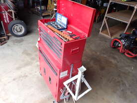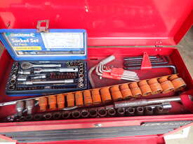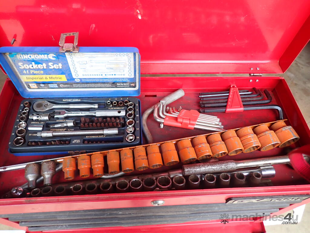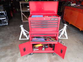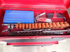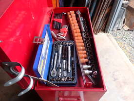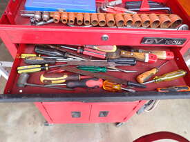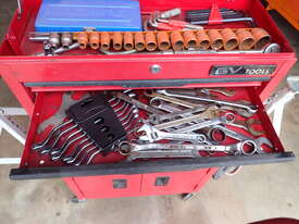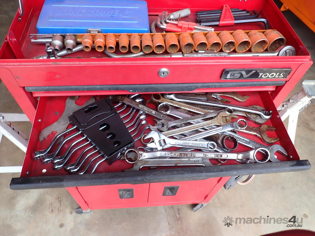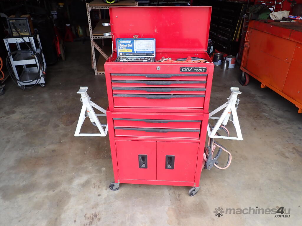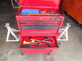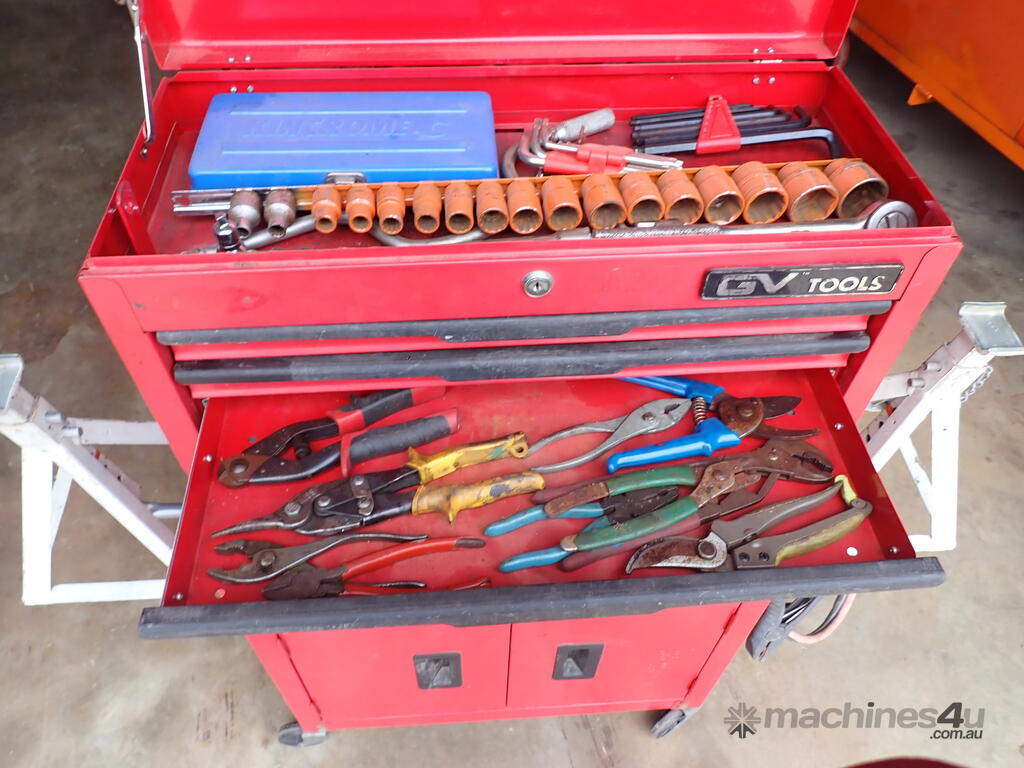 Rolling toolbox/cabinet with tools, GV Tools brand box, small 6 drawer and 2 door, with tools including socket sets 1/4 & 3/8 & 1/2 inch drive, spanners, screwdrivers, hammers, allen keys, pliers, cutters, bolt cutters , cable cutters, wiring crimp kit, 1/2 inch air rattle gun, files, saws, grease gun, torx bits & keys, jumper leads, pair of small stands, etc., in good condition.