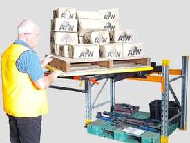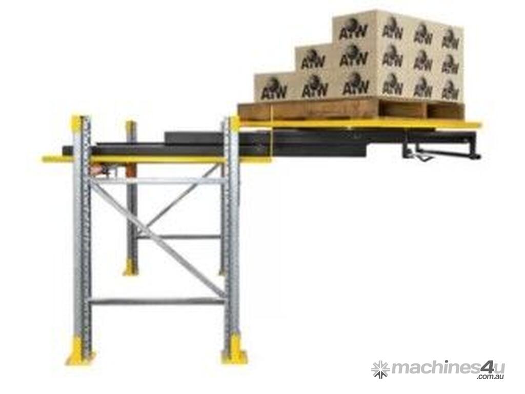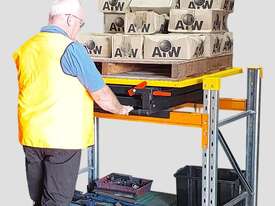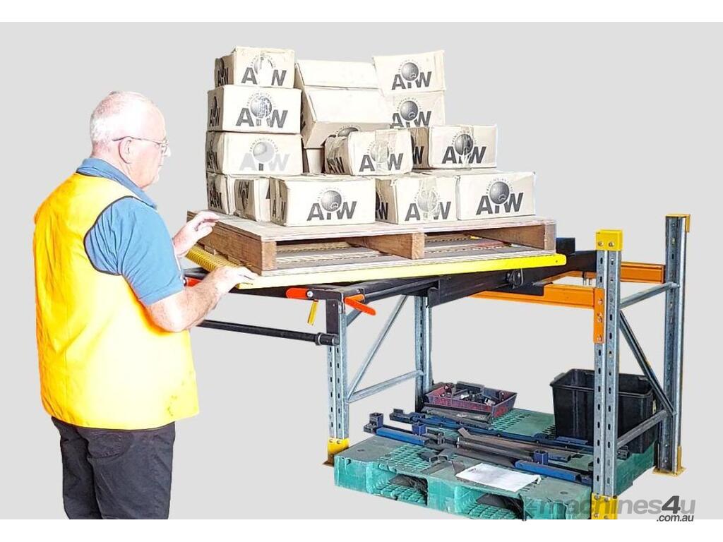 It allows a store person to extend the pallet outward from your existing shelving rack, then rotate the pallet by hand and push it back into the racking.