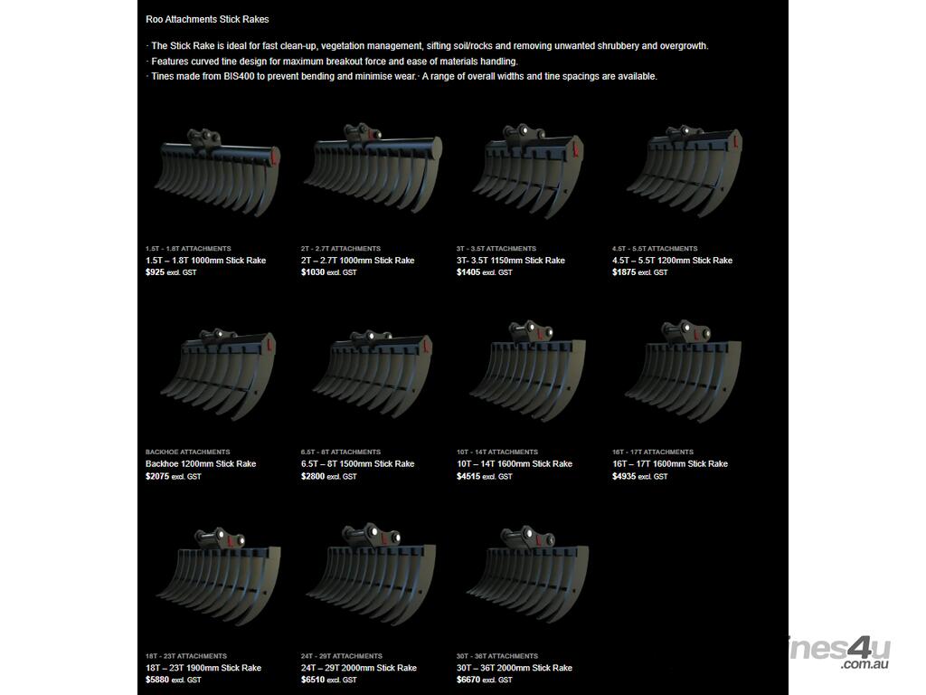 We stock Stick Rakes to suit 20T and up machines and make to order up to 120T.