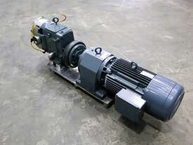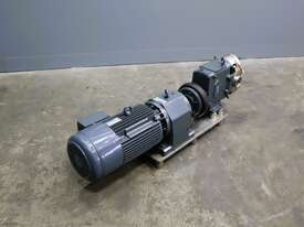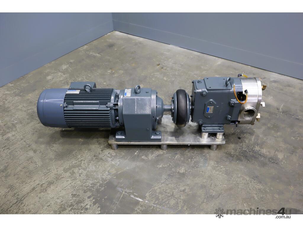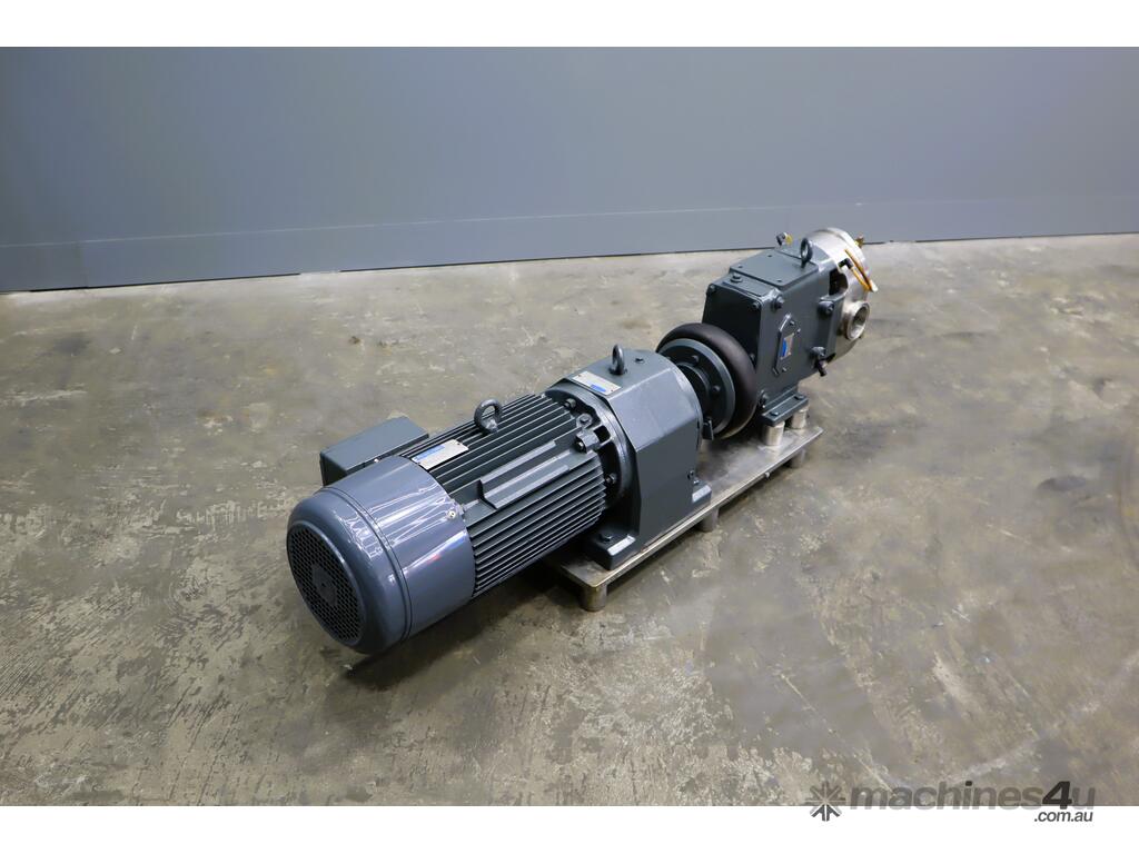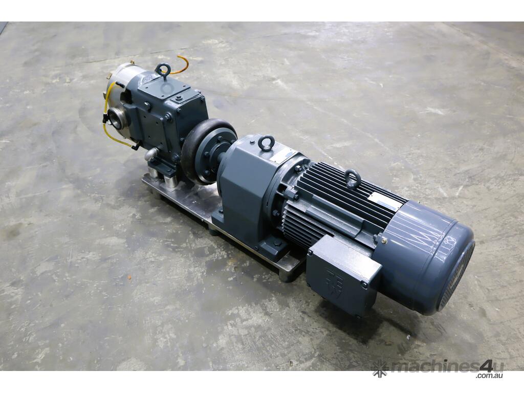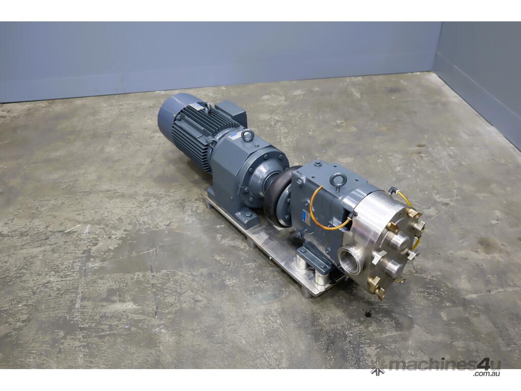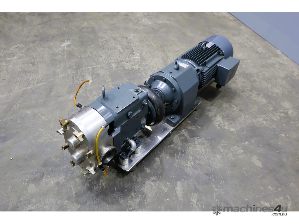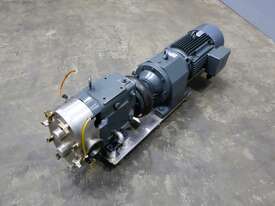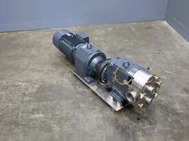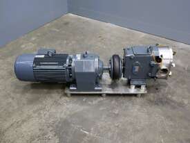Waukesha Cherry Burrell positive displacement lobe pump, complete with electric motor, gearbox, flexible coupling, and stainless steel pump head, mounted on a compact base frame. In excellent condition, this unit is designed for hygienic fluid transfer applications where gentle handling and consistent flow are required. Commonly used in food, dairy, beverage processing etc.