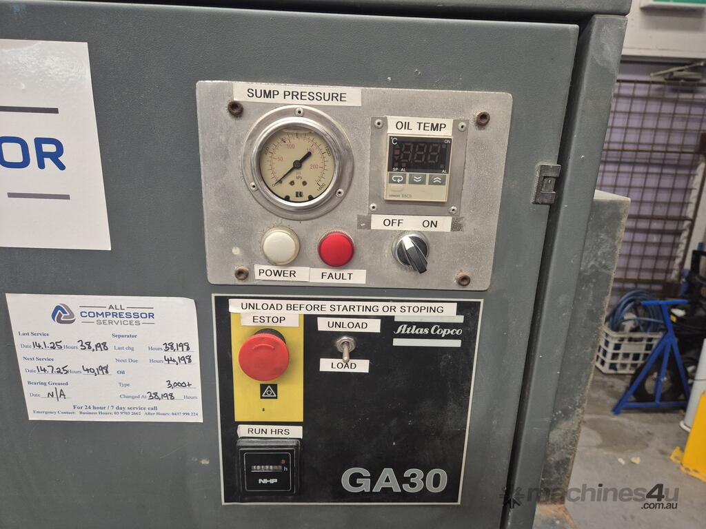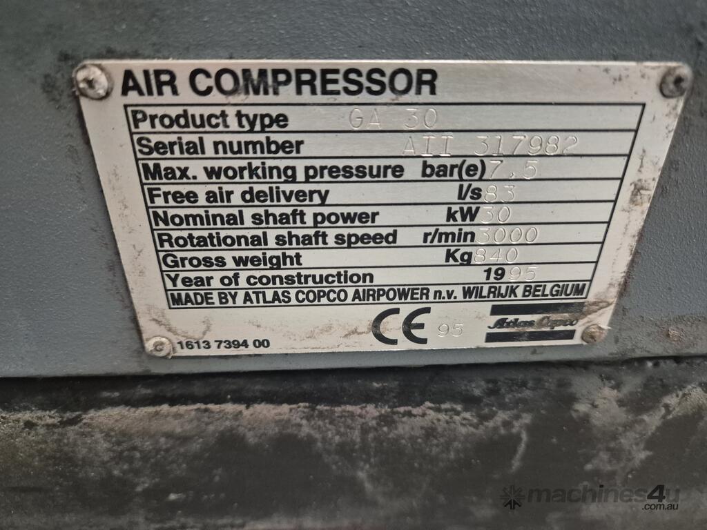One secondhand Atlas Copco GA30 rotary screw air compressor which supplies 176 CFM 7.5 BAR pressure. Serial number is AII 317982. Compressor has been fully tested and comes with a 3 month ACS warranty (conditions apply). Machine is direct drive. Machine has manual stop/start controls (no expensive controller to replace). Priced to sell !