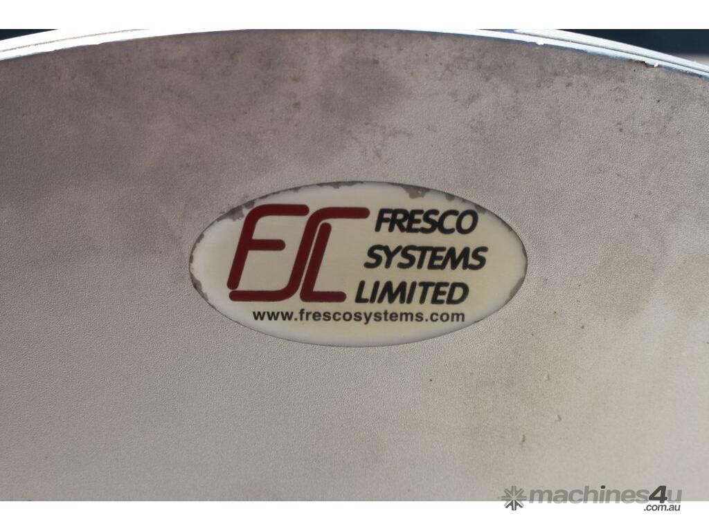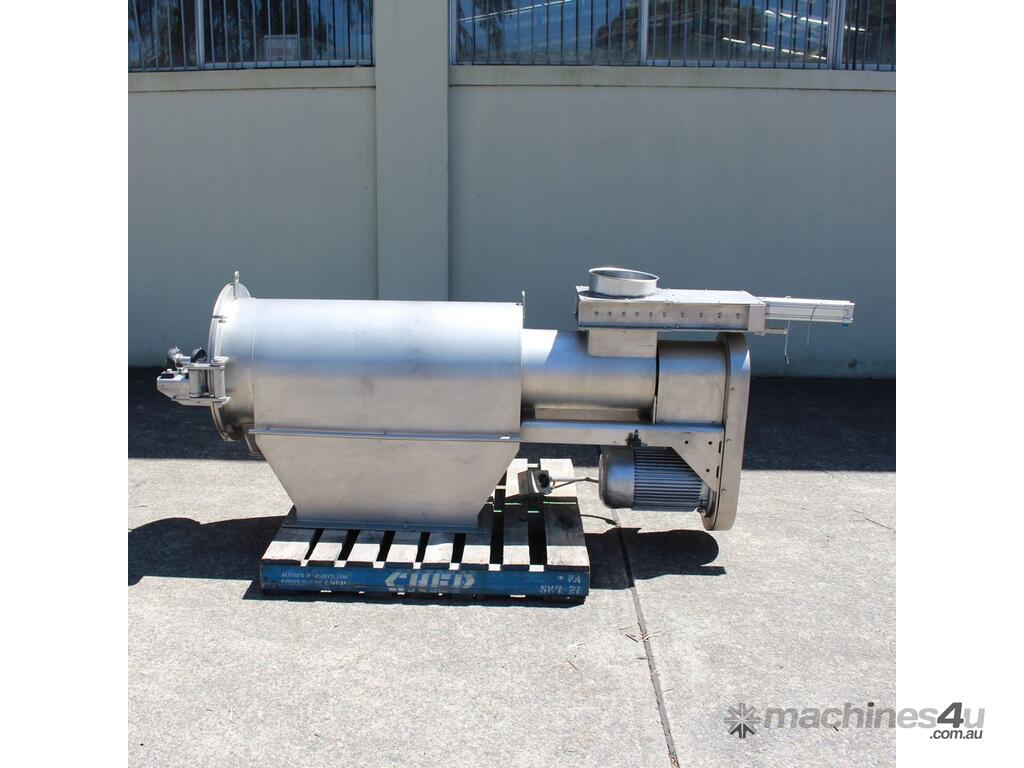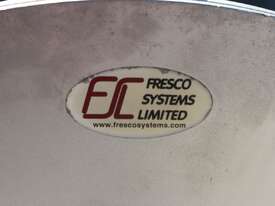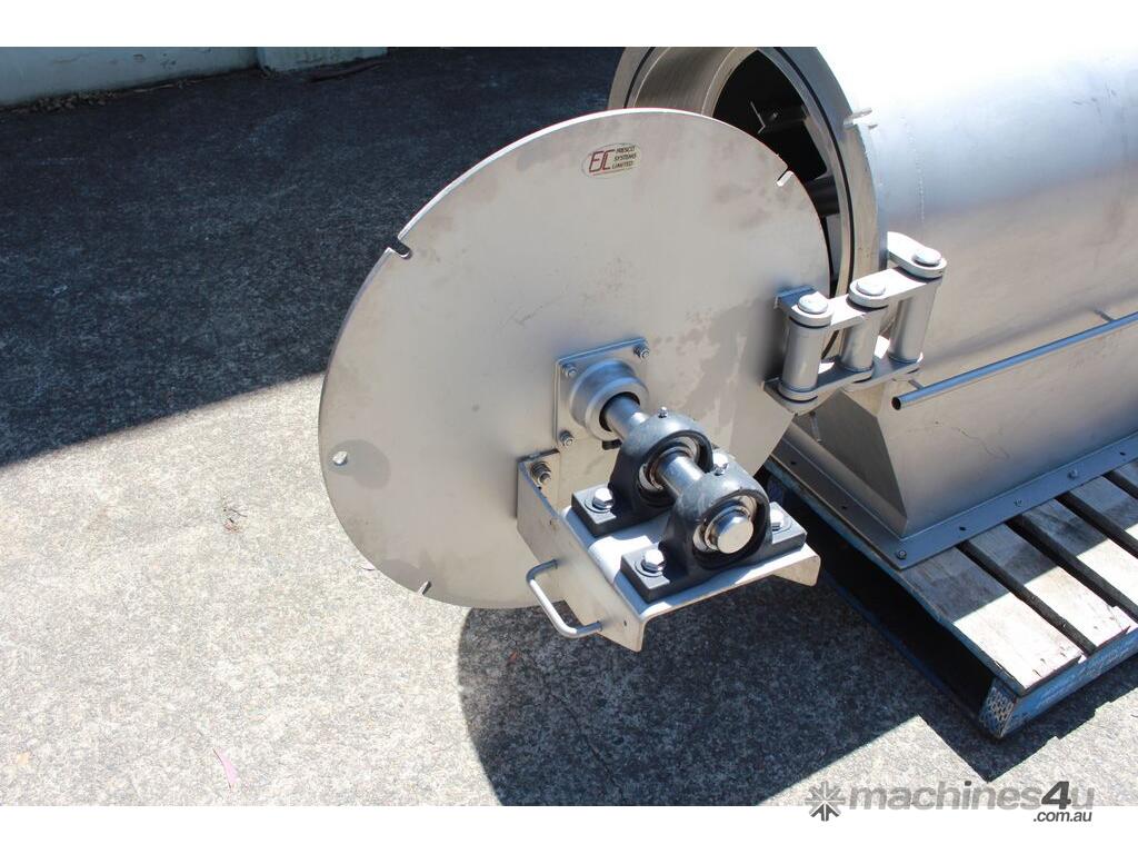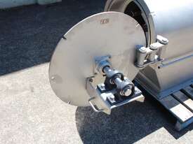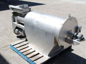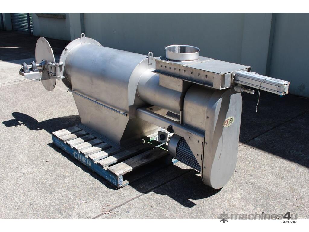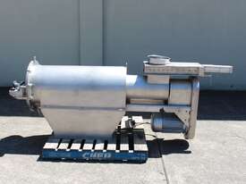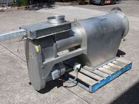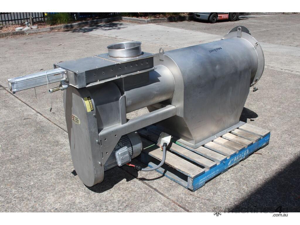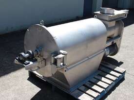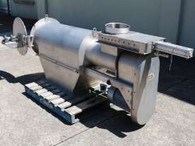 Rotary Sieve, "Fresco", 240mm dia inlet with pneumatic shutoff valve, feeding to a auger infeed and then into a 450mm dia x 1000mm long screen, all stainless steel wetted parts, hopper discharge dimensions: 700mm x 510mm wide, 70mm dia outlet, driven by 3 phase 4kw, requires screen