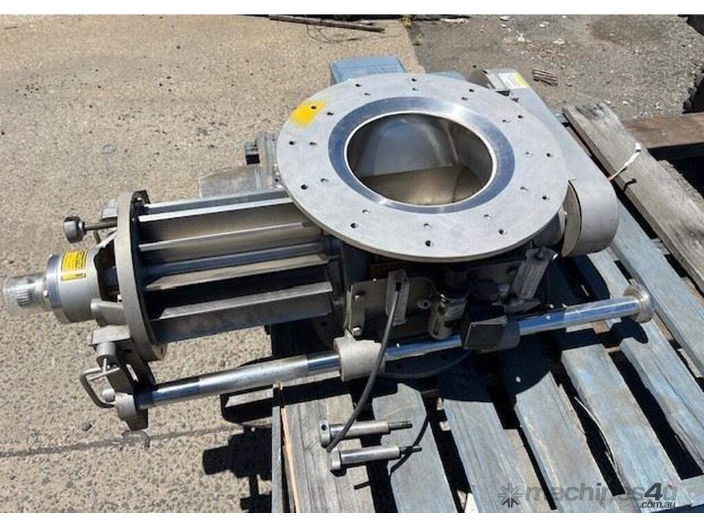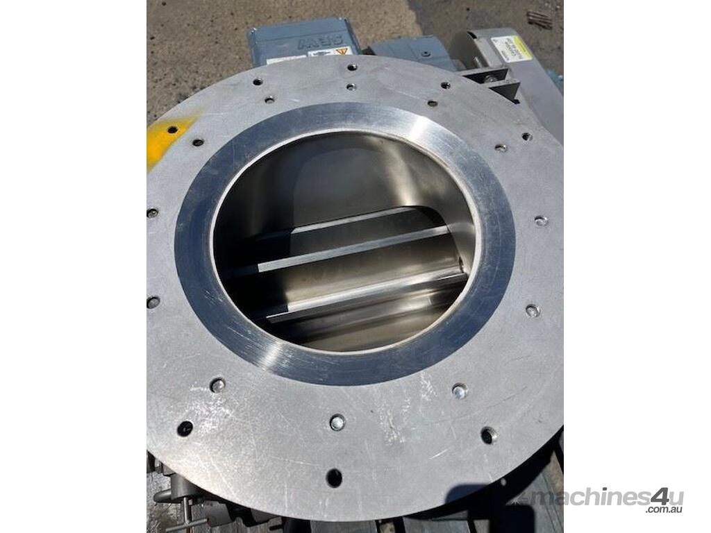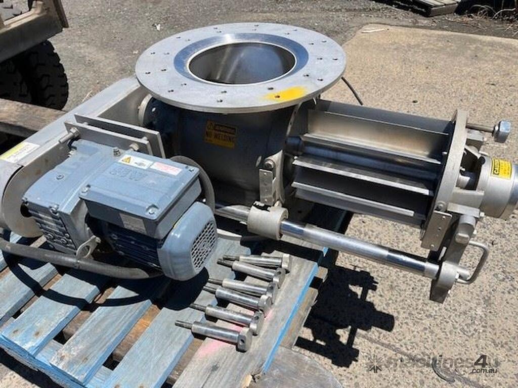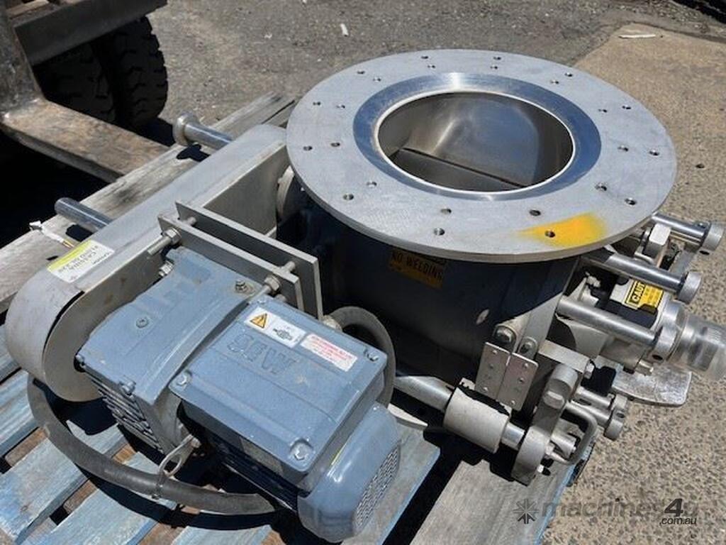 Stainless steel sanitary rotary valve. Drop through type. Air purged seals. 10 inch inlet/outlet Easy clean removable rotor for cleaning in place. SEW geared drive 0.37kw 11 rpm Capacity approx 10 M3 hour at 11 rpm. 4 available. Price per unit.
