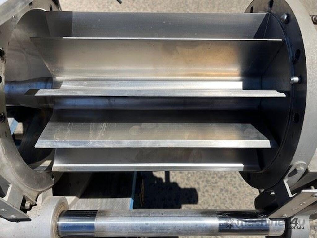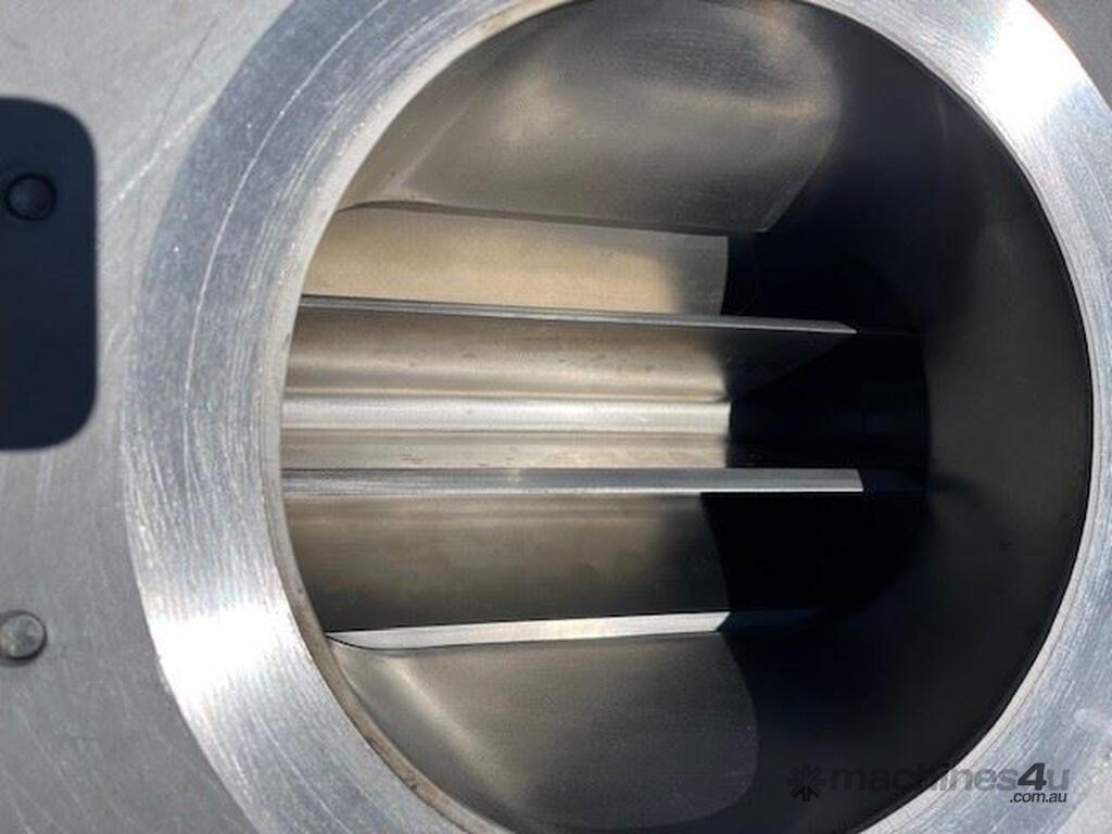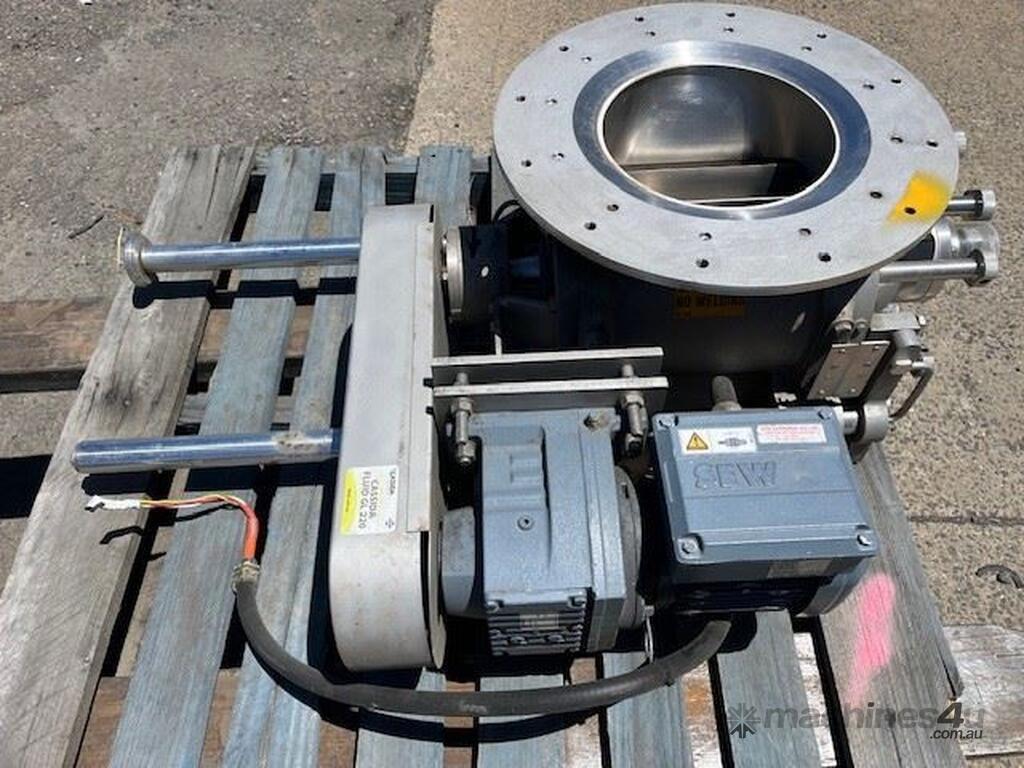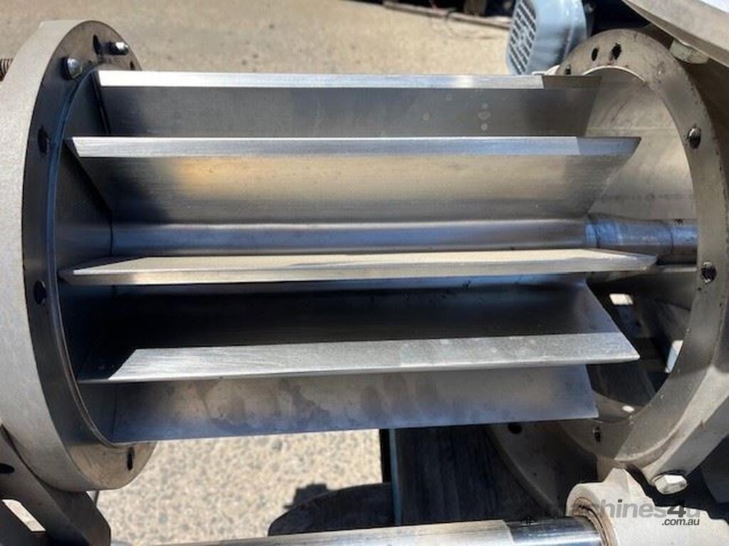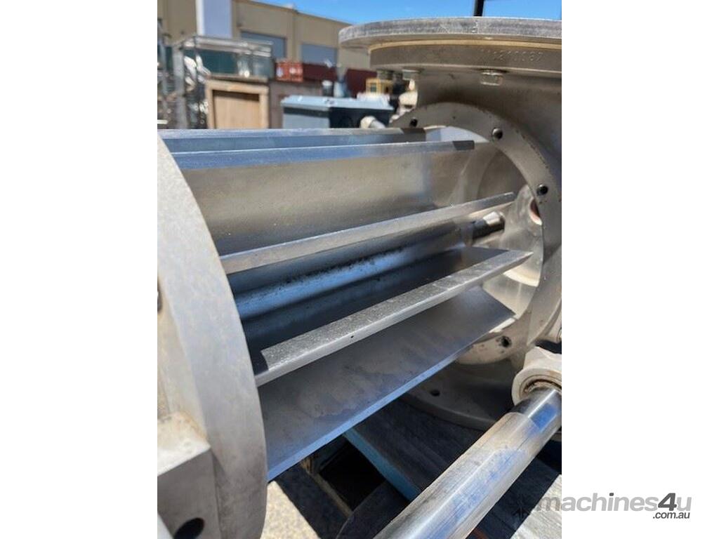 Stainless steel sanitary rotary valve. Drop through type. Air purged seals. 10 inch inlet/outlet Easy clean removable rotor for cleaning in place. SEW geared drive 0.37kw 11 rpm Capacity approx 10 M3 hour at 11 rpm. 4 available. Price per unit.