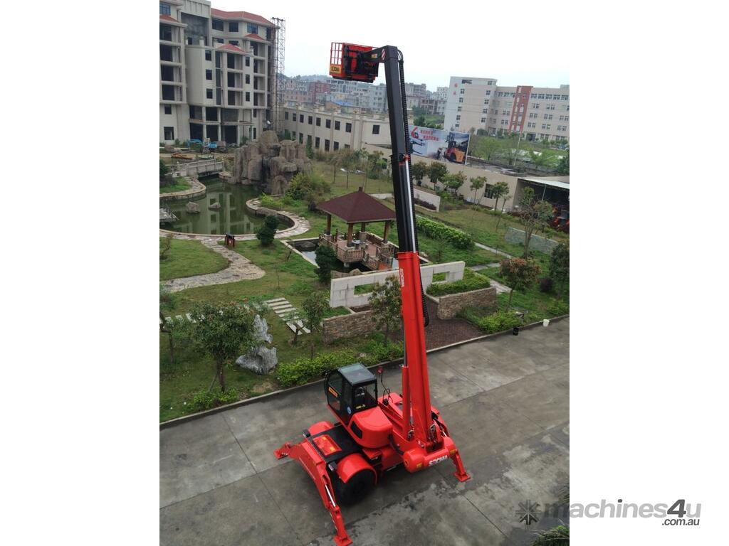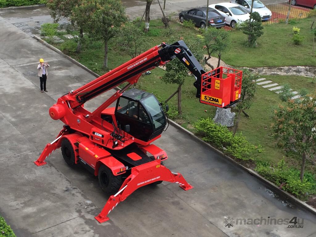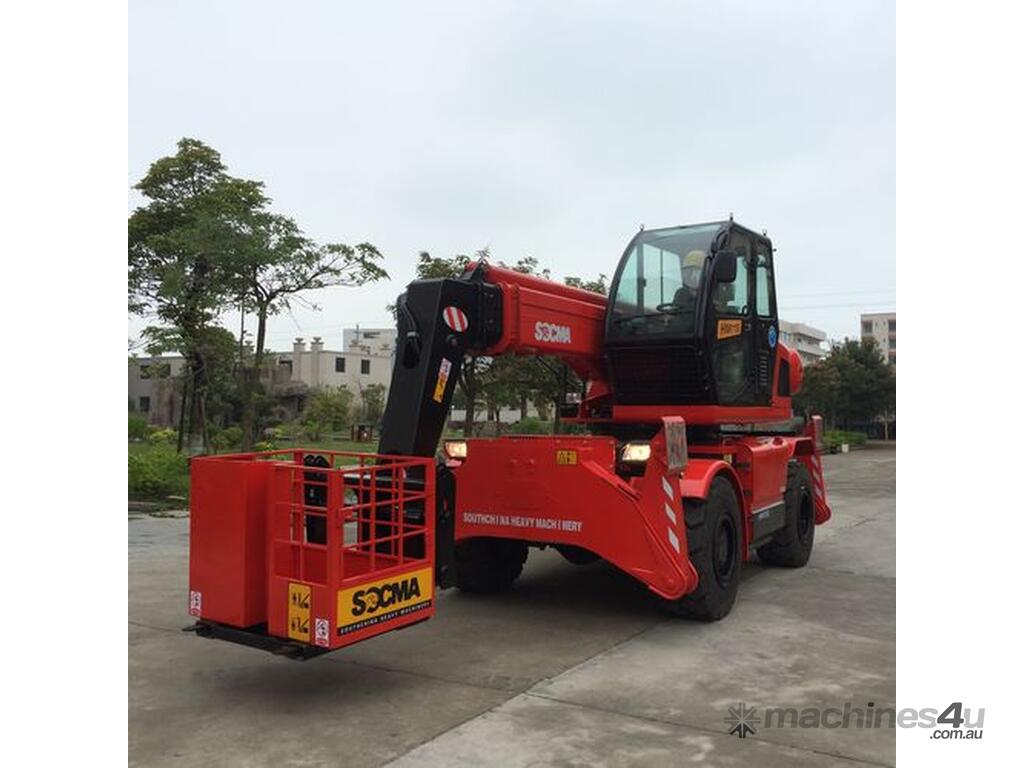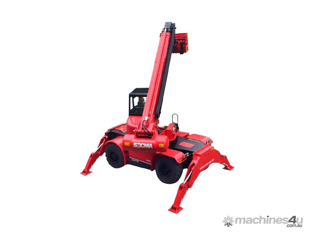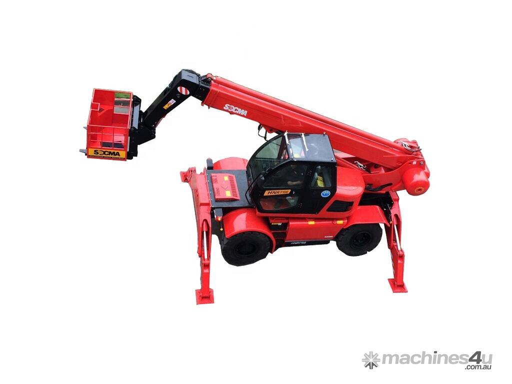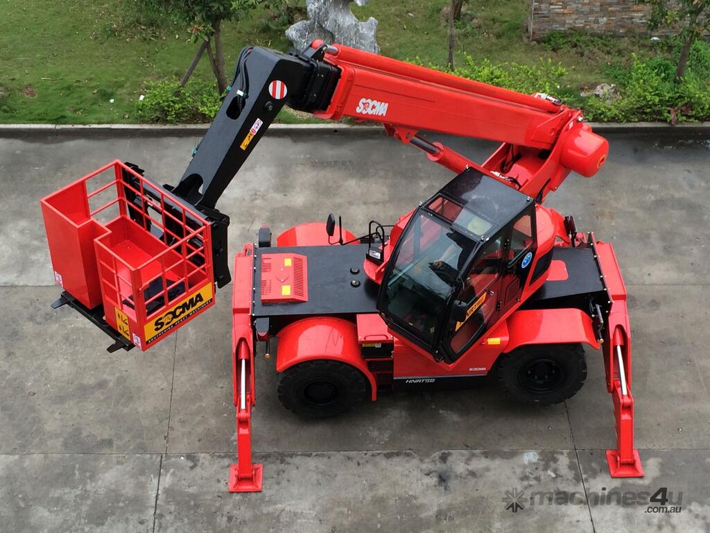 The HNTR40 is a multi-purpose rough terrain rotating telehandler, similar to the Manitou machines. It is suitable for construction site and industrial areas. The HNTR40 is fitted with a diesel engine, hydrostatic transmission, pilot control, 4WD driving, rear wheel steering with out rigger, hydraulic stabilizer for boom placing, stretching and withdrawing. The lifting height is 15m, rated load capacity 4tons, 360 degree rotate chassis. Max horizontal reach 10500mm (front end of front wheel to load centre). It can be used as telescopic forklift loader, crane loader or working platform.