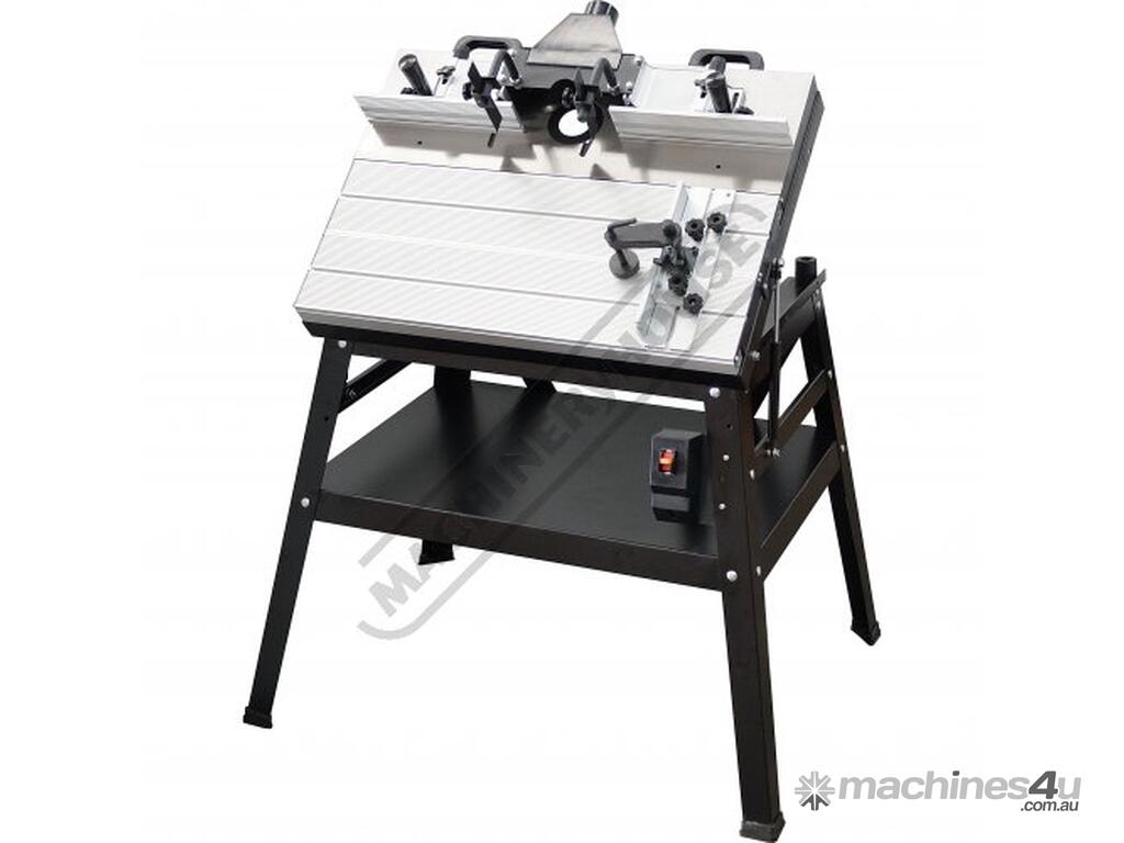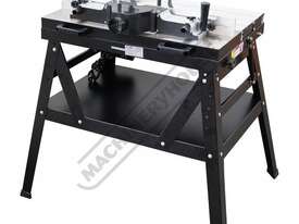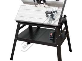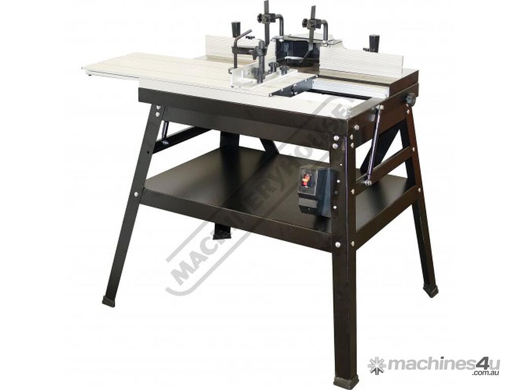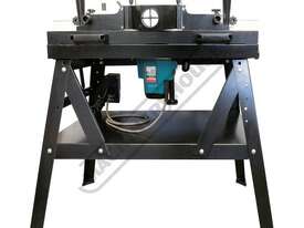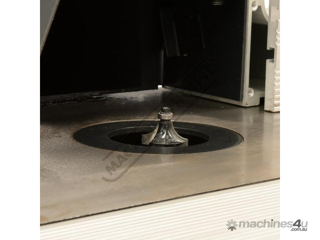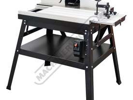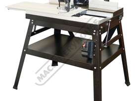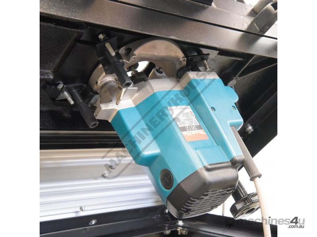 The RT-100 utilises a sliding table that makes material processing much easier and safer, particularly when making raised panels or shaping short sides. The split fence is easy to adjust and provides full support along both sides of the work-piece. Other features include a 60mm dust port with hood, tilt-up table with gas strut supports for easy router access, universal router mount and sturdy stand with a convenient shelf. Last but not least, a conveniently front mounted main switch allows you to turn the router ON/OFF without bending over and reaching under the table. Very convenient!