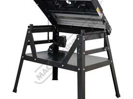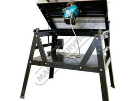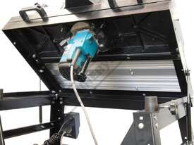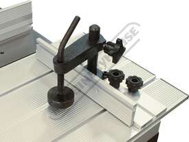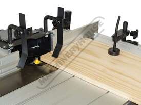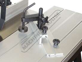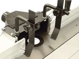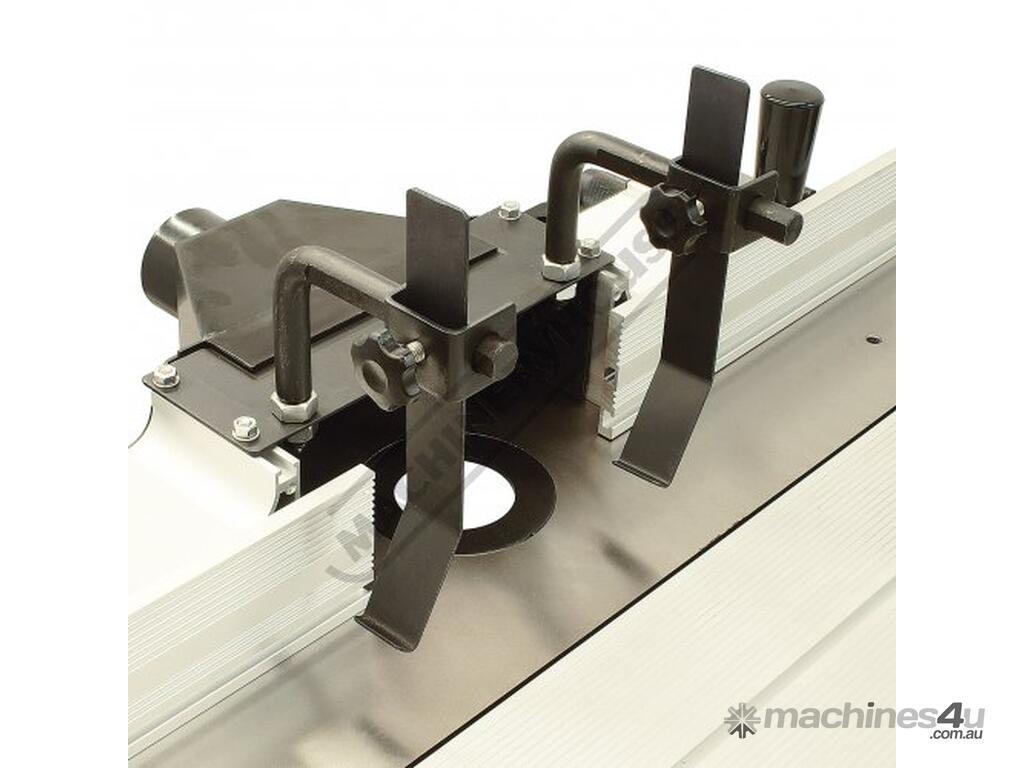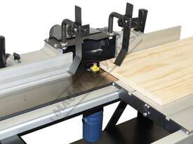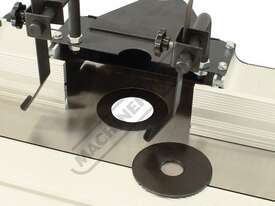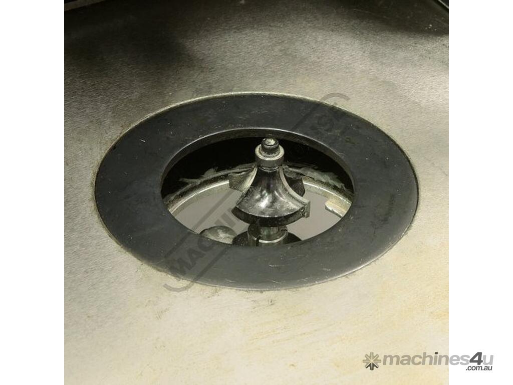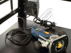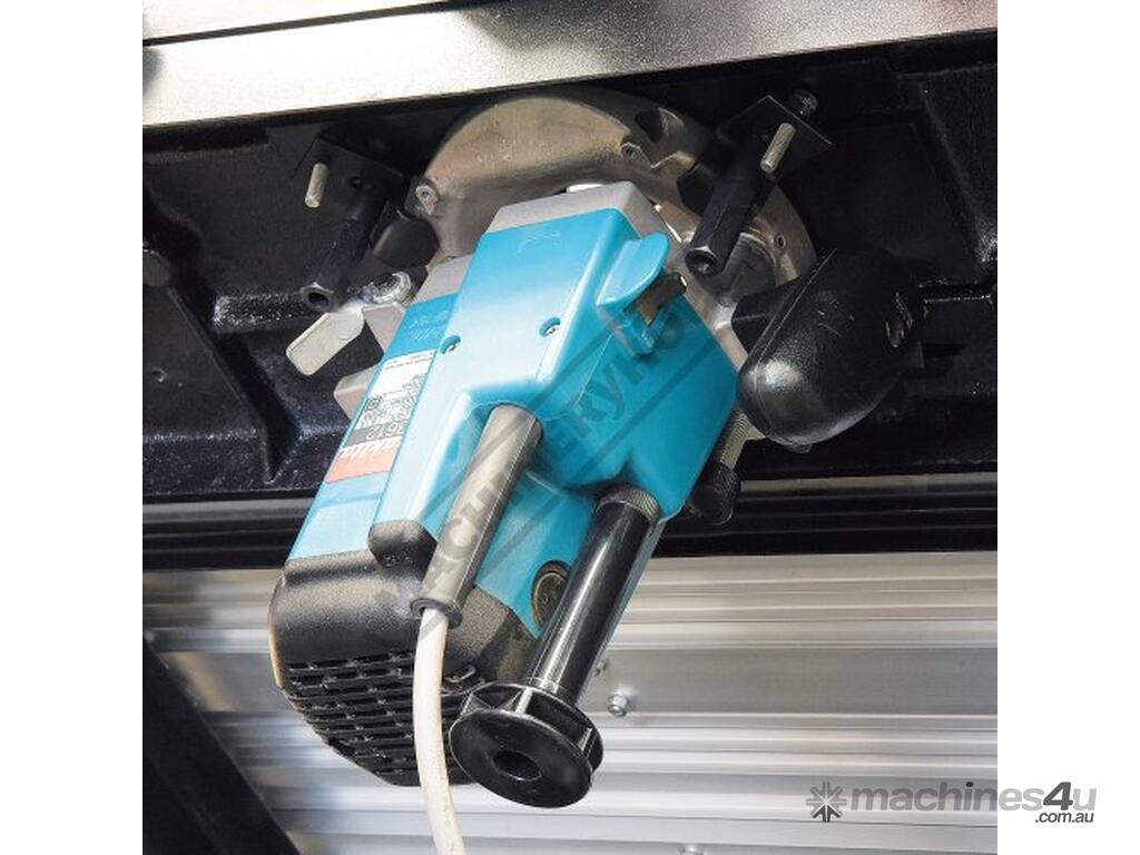 The RT-100 utilises a sliding table that makes material processing much easier and safer, particularly when making raised panels or shaping short sides. The split fence is easy to adjust and provides full support along both sides of the work-piece. Other features include a 60mm dust port with hood, tilt-up table with gas strut supports for easy router access, universal router mount and sturdy stand with a convenient shelf. Last but not least, a conveniently front mounted main switch allows you to turn the router ON/OFF without bending over and reaching under the table. Very convenient!